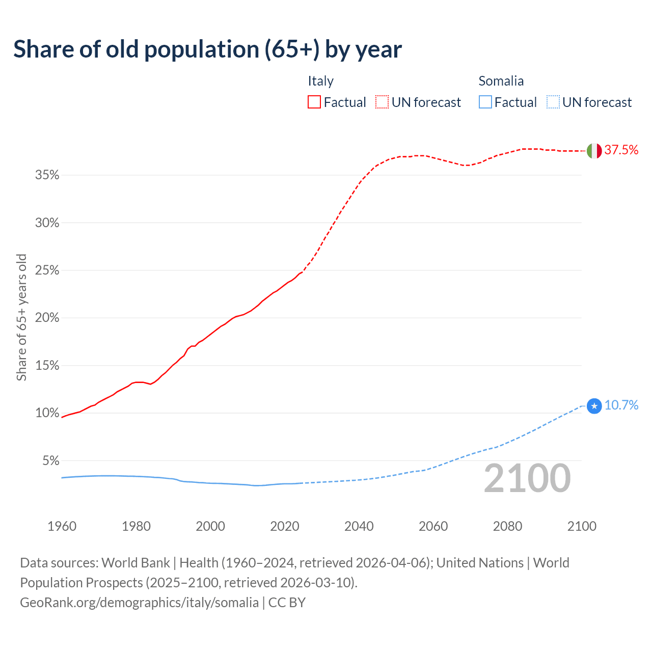 The share of older people aged 65 and over is 24.6% in Italy and 2.59% in Somalia. Life expectancy in Italy compared to Somalia .