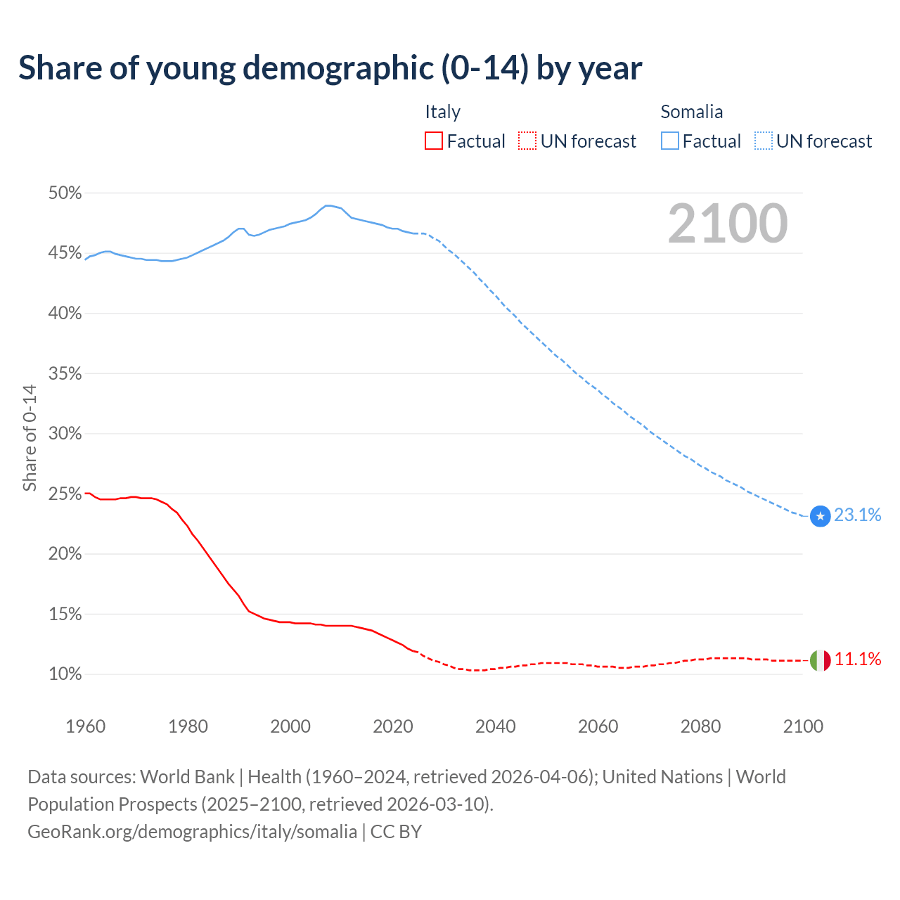 - The share of young demographic (0-15 years old) in Italy is 11.9% vs 46.6% in Somalia.