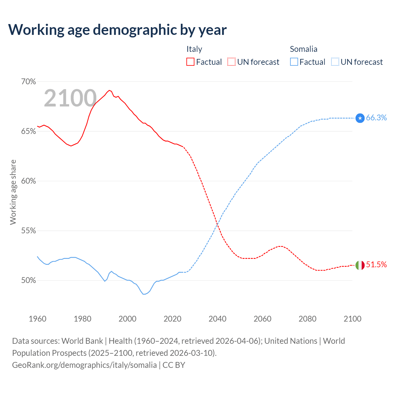 - Italy has 37.2M working age adults (aged 15-64) vs 10.4M in Somalia.