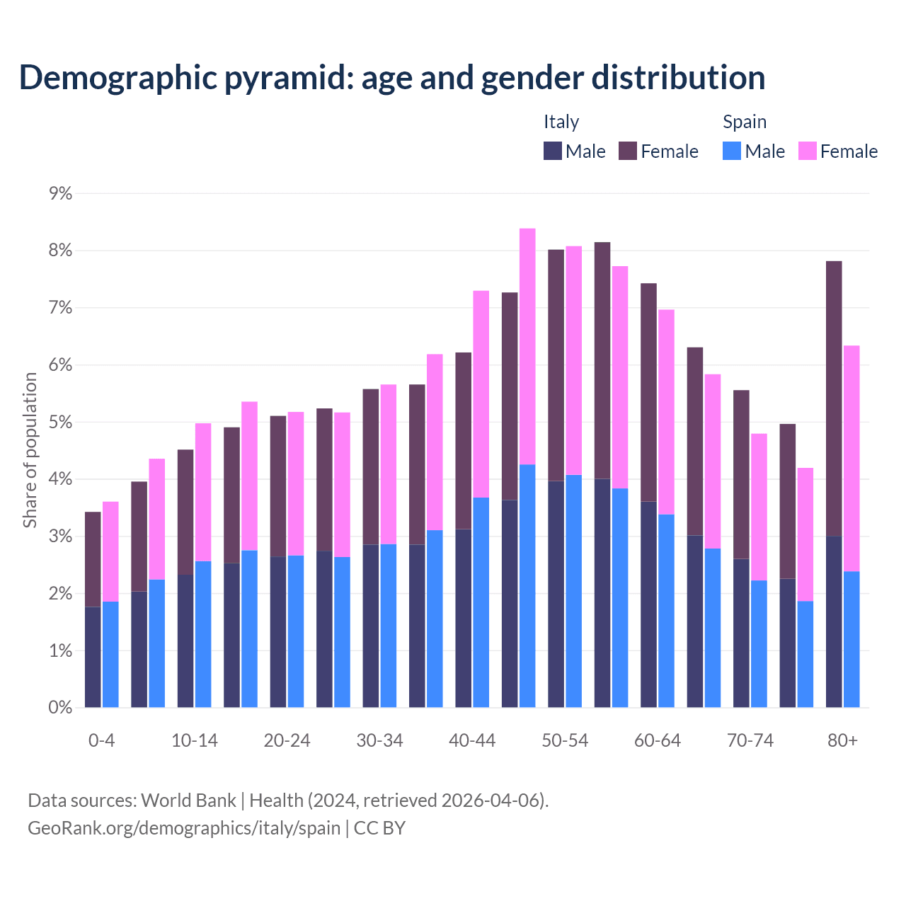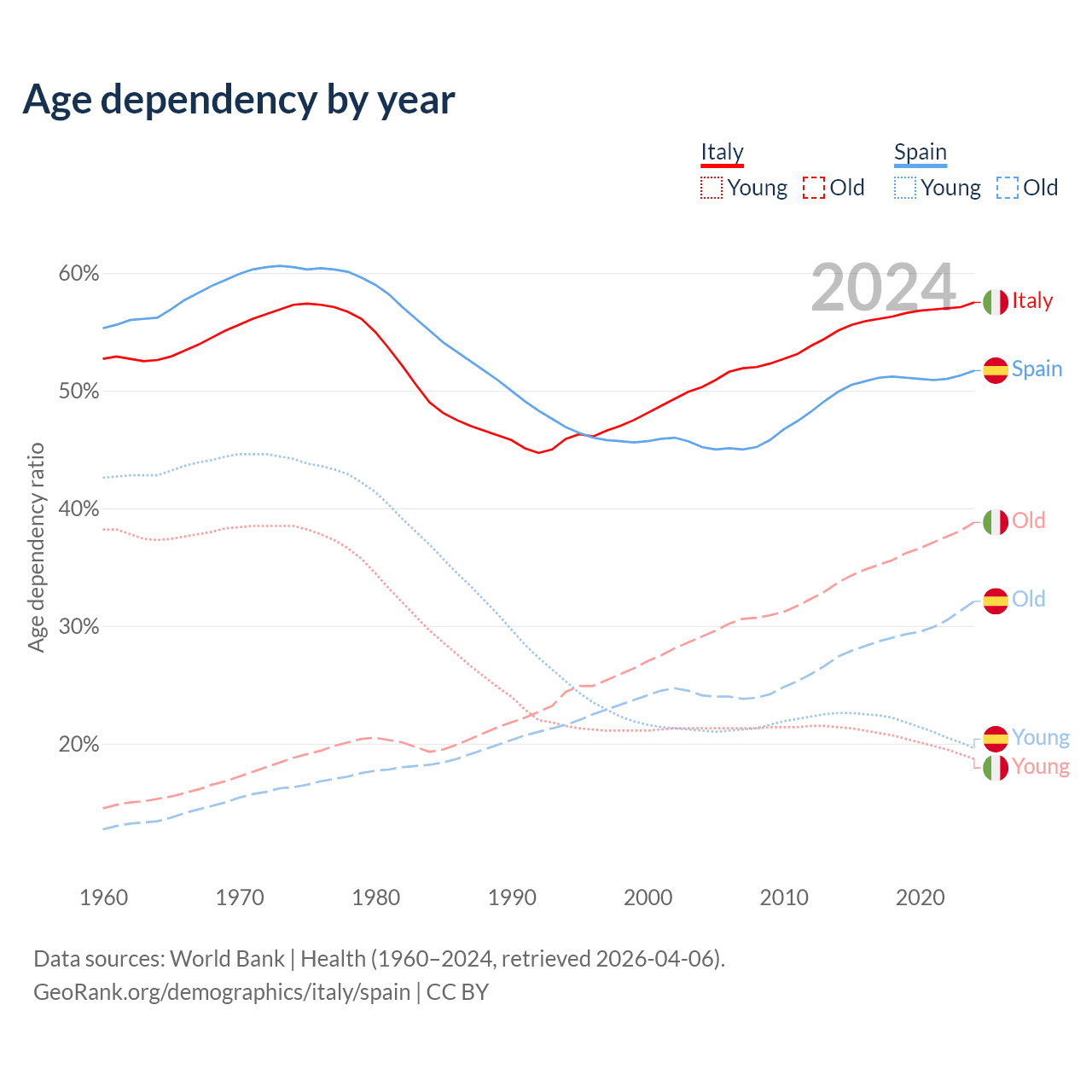 - Italy is ranked 4/196 by median age (oldest to youngest) vs 7/196 for Spain.
