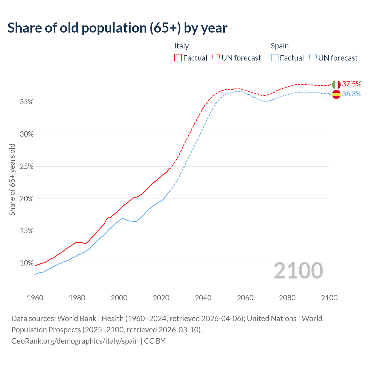 The share of older people aged 65 and over is 24.6% in Italy and 21.1% in Spain. Life expectancy in Italy compared to Spain .