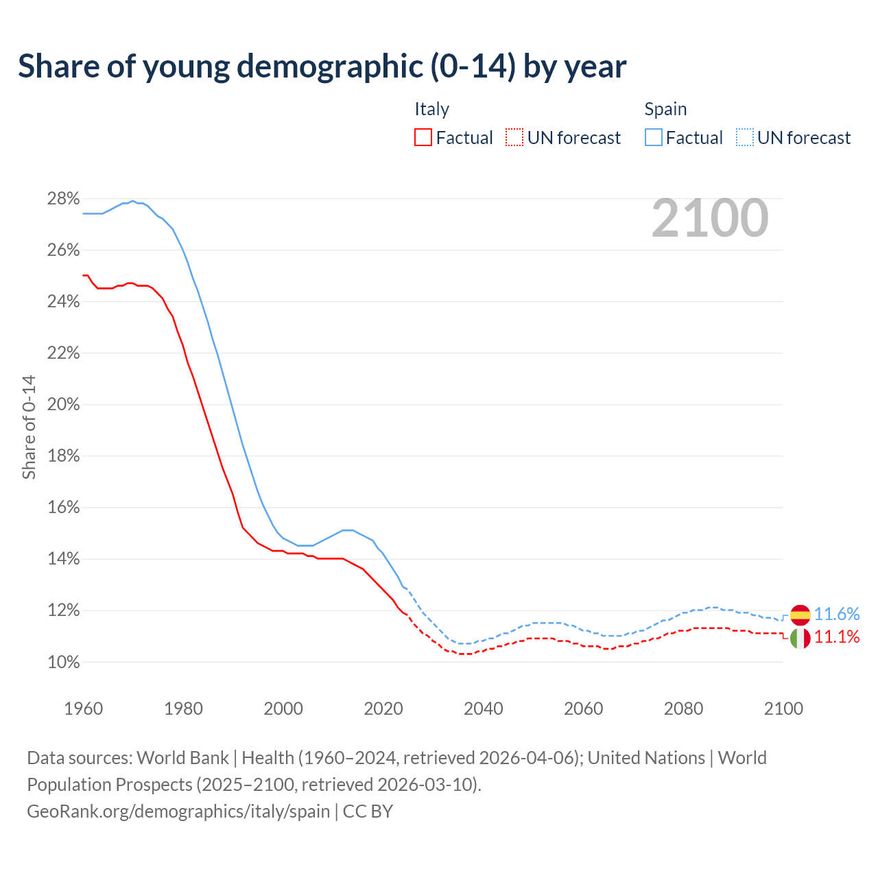 - As of 2026, the population of Italy is 58.6M vs 48.8M in Spain.