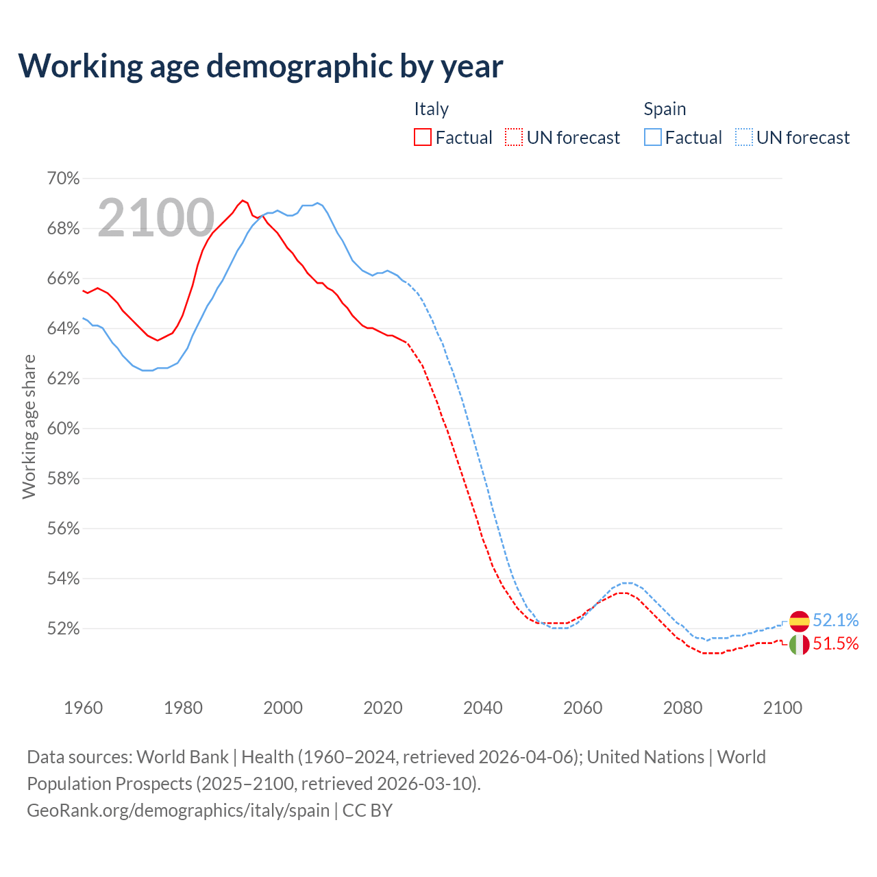 - Italy has 37.2M working age adults (aged 15-64) vs 32.2M in Spain.