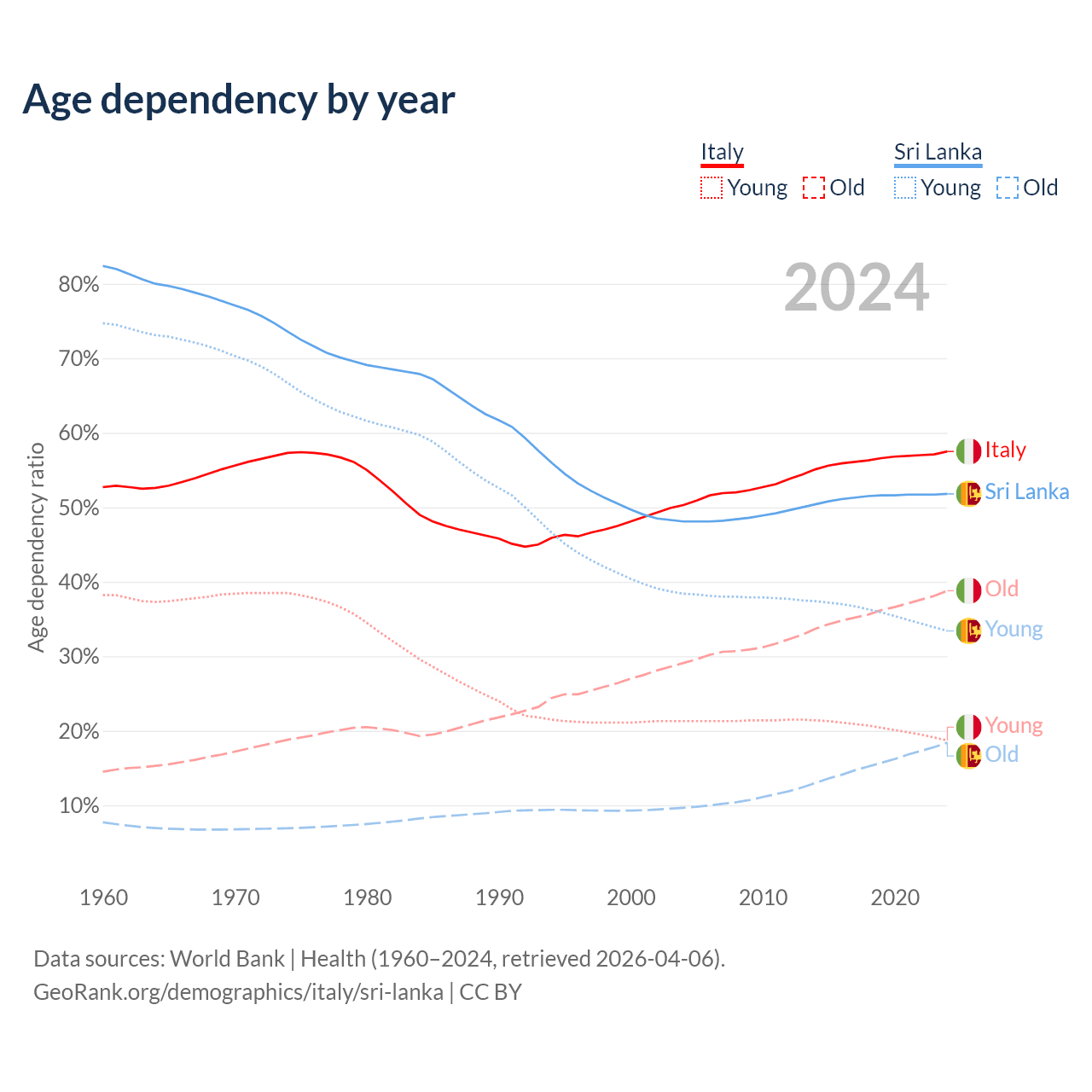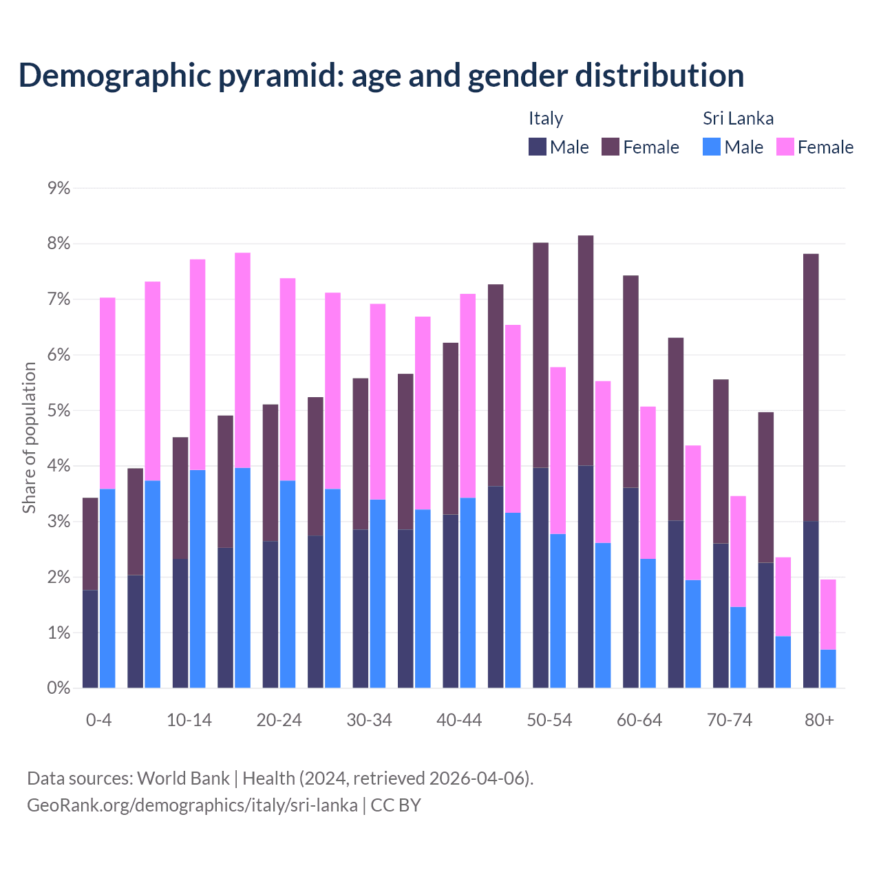 - Italy is ranked 4/196 by median age (oldest to youngest) vs 81/196 for Sri Lanka.