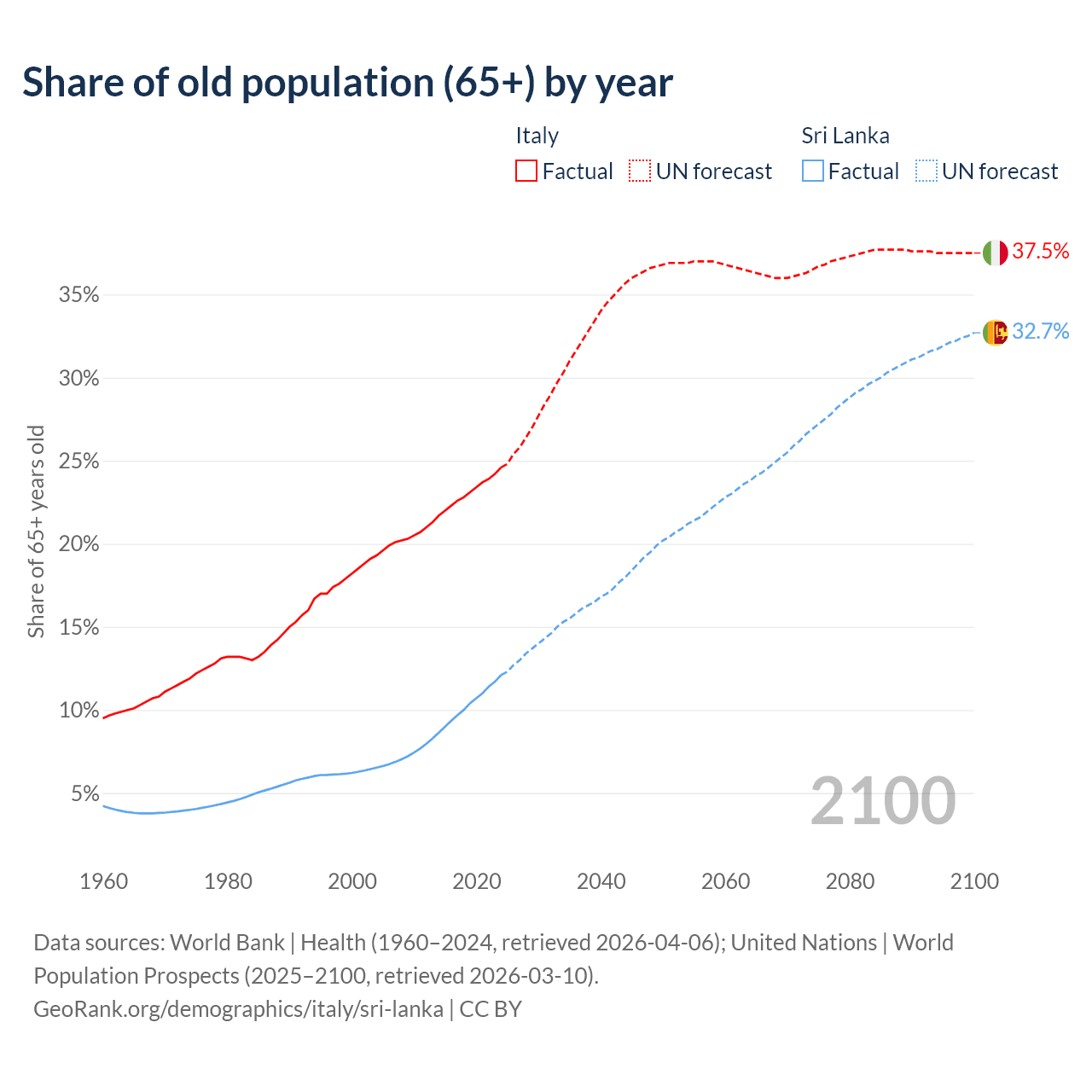 The share of older people aged 65 and over is 24.6% in Italy and 12.1% in Sri Lanka. Life expectancy in Italy compared to Sri Lanka .