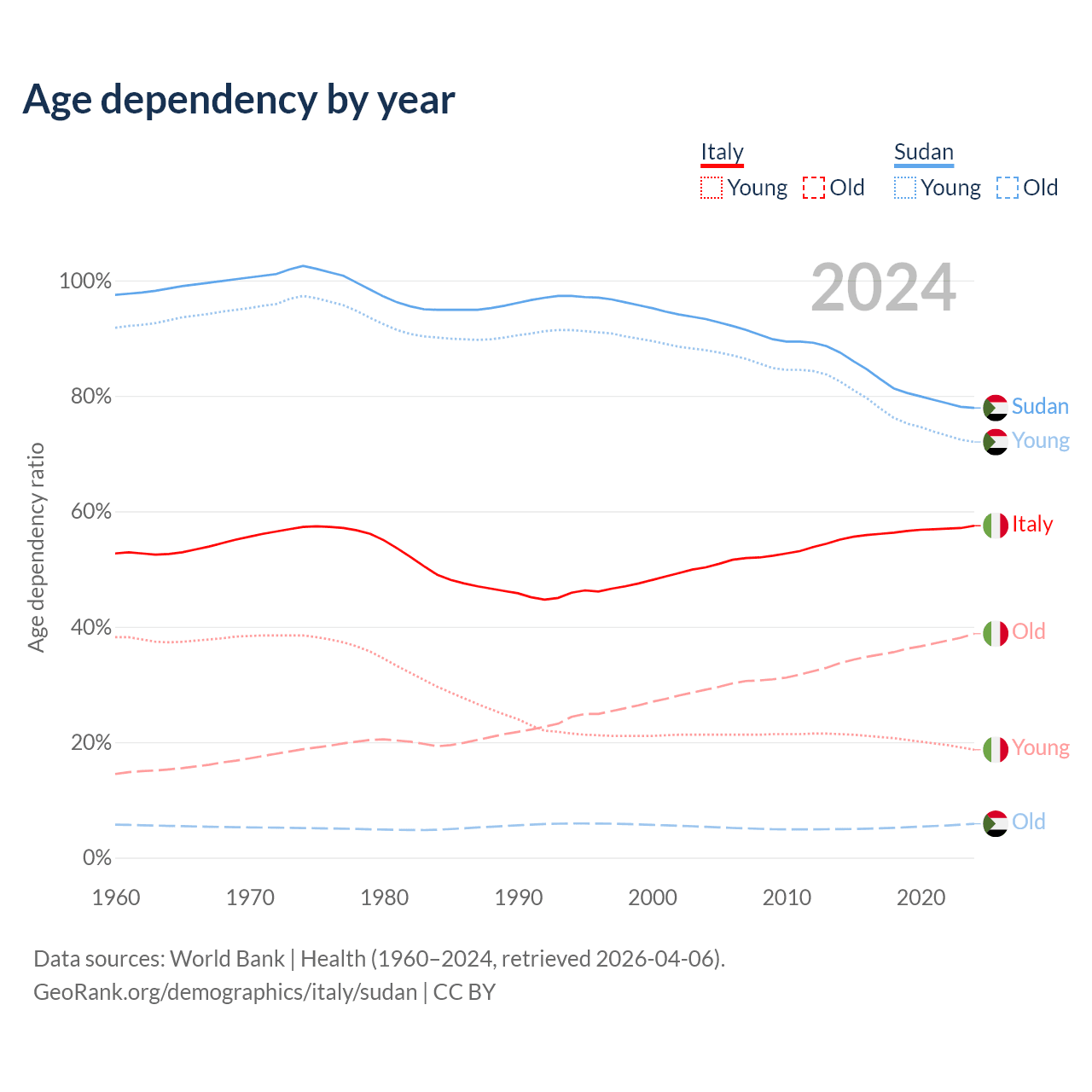 - Italy is ranked 4/196 by median age (oldest to youngest) vs 172/196 for Sudan.