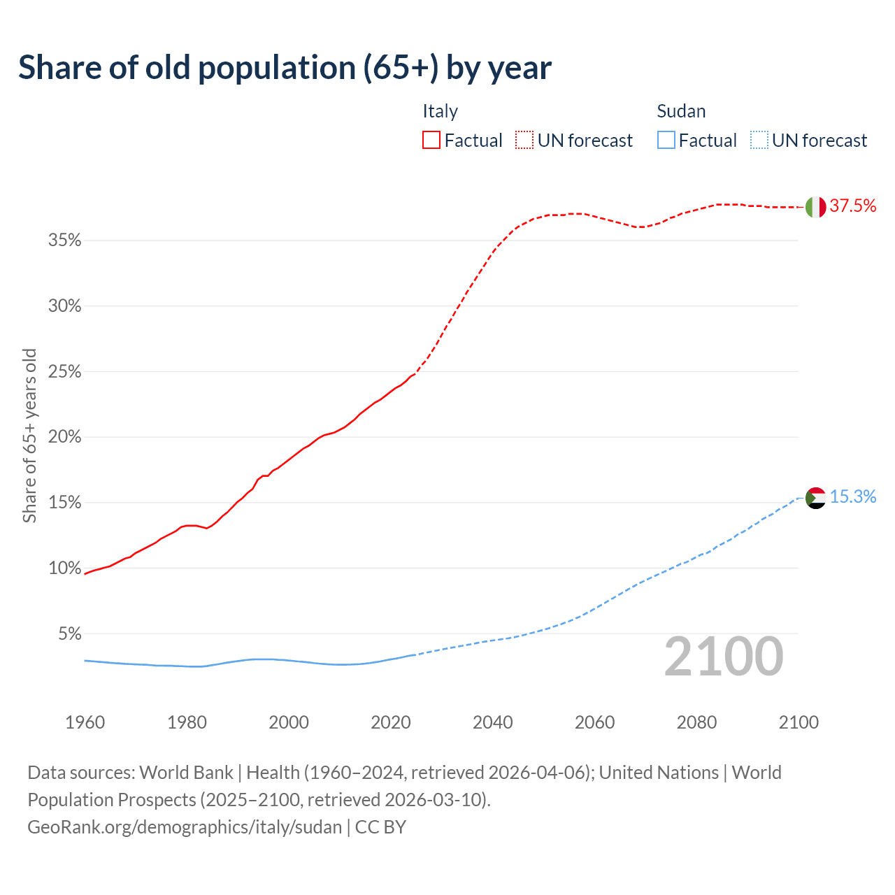 The share of older people aged 65 and over is 24.6% in Italy and 3.3% in Sudan. Life expectancy in Italy compared to Sudan .