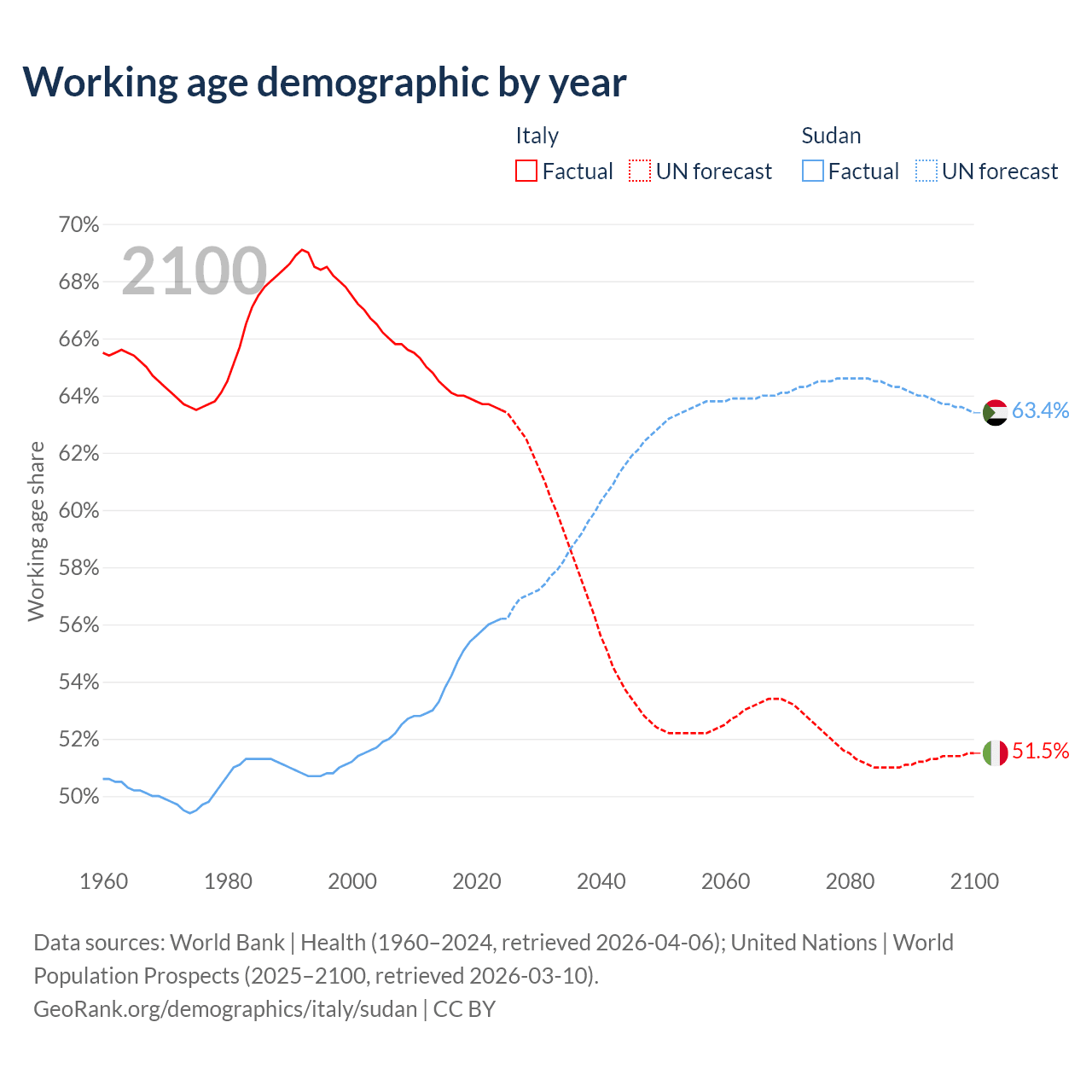 - Italy has 37.2M working age adults (aged 15-64) vs 30M in Sudan.
