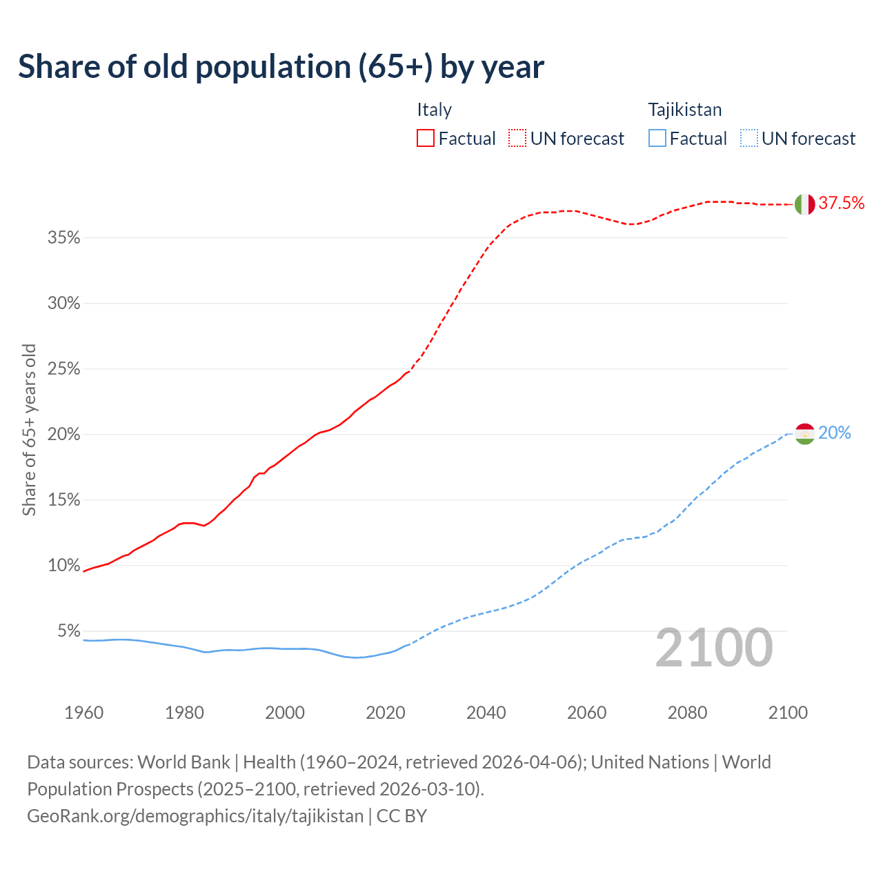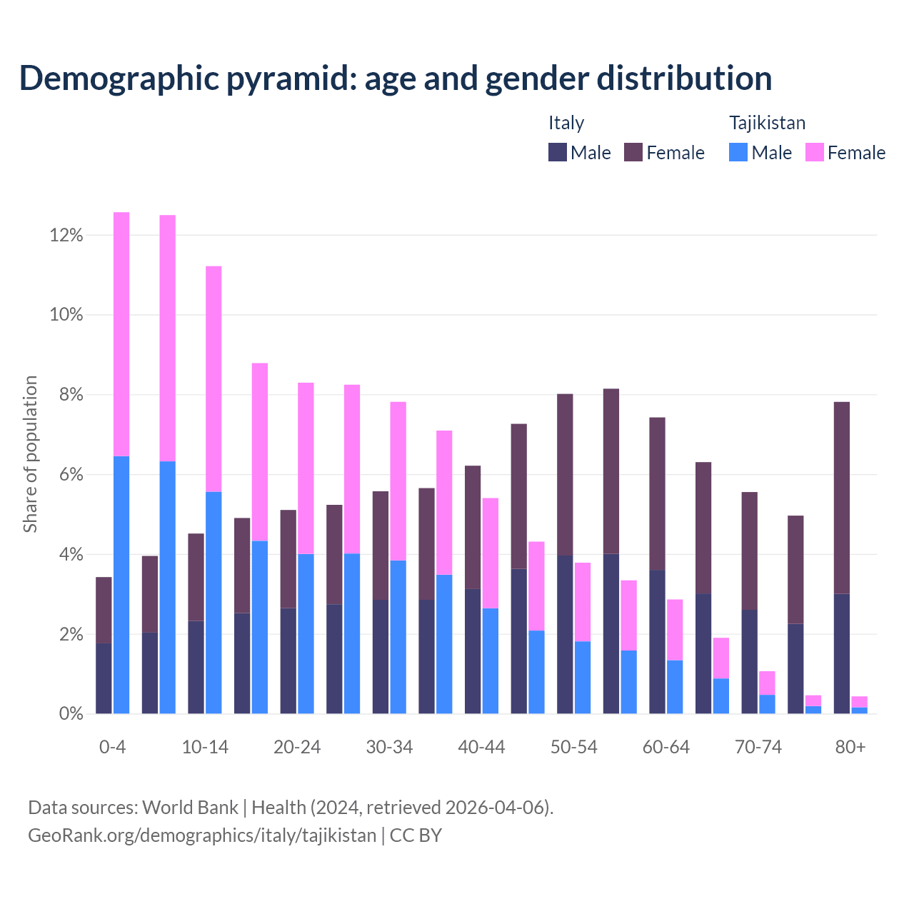 The share of older people aged 65 and over is 24.6% in Italy and 3.85% in Tajikistan. Life expectancy in Italy compared to Tajikistan .