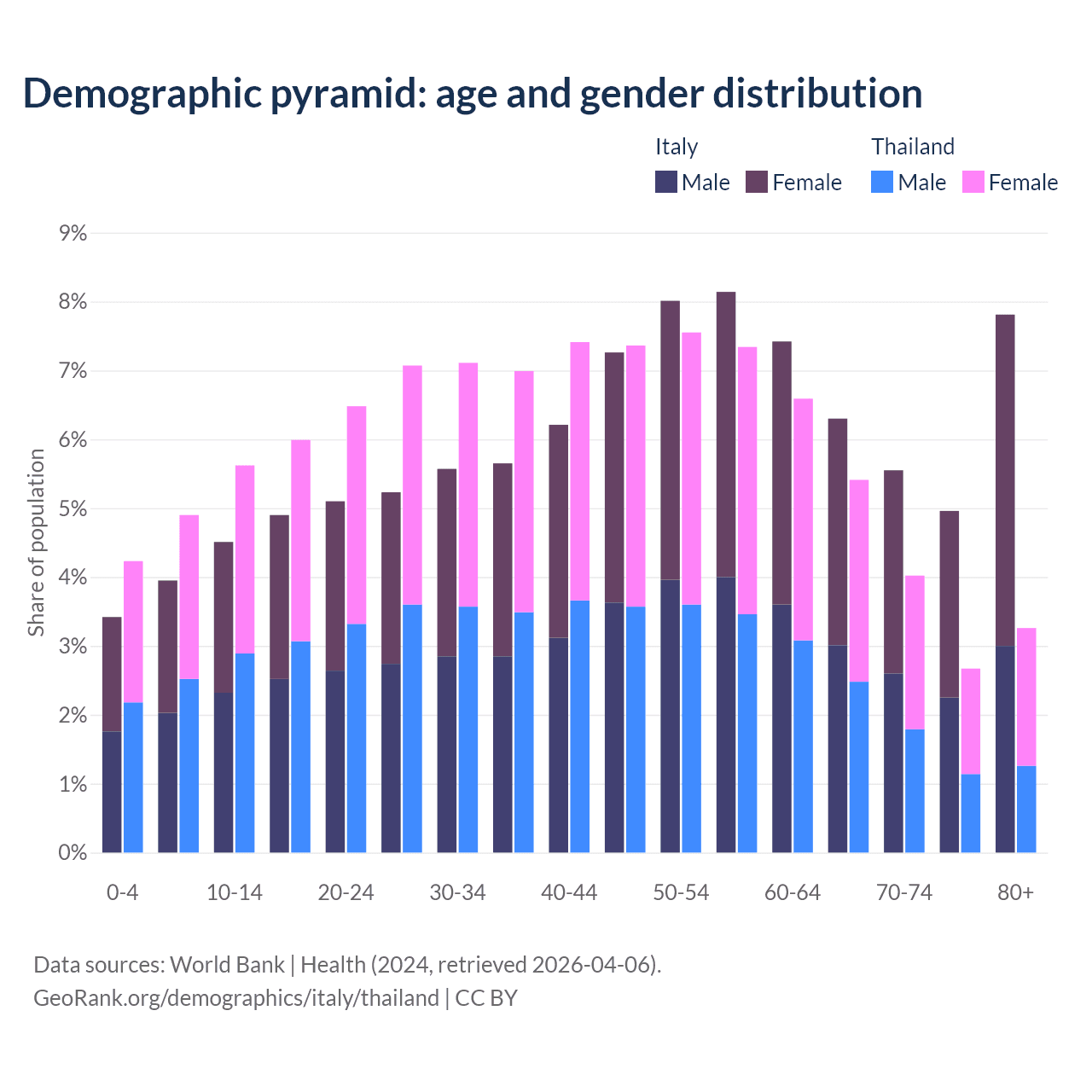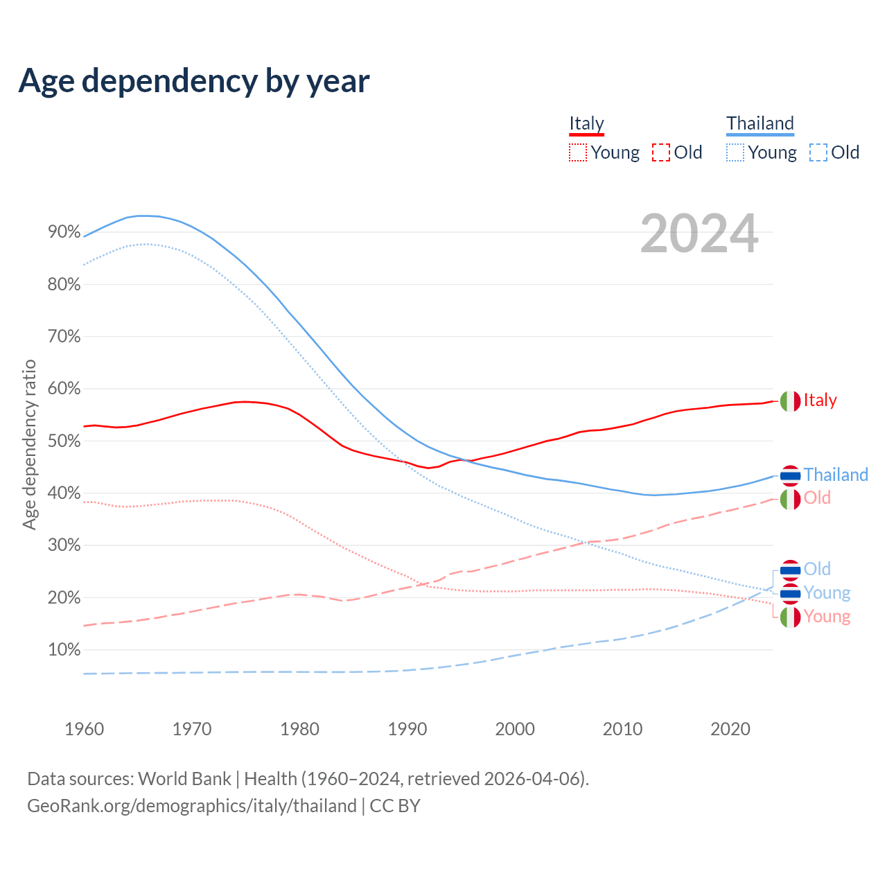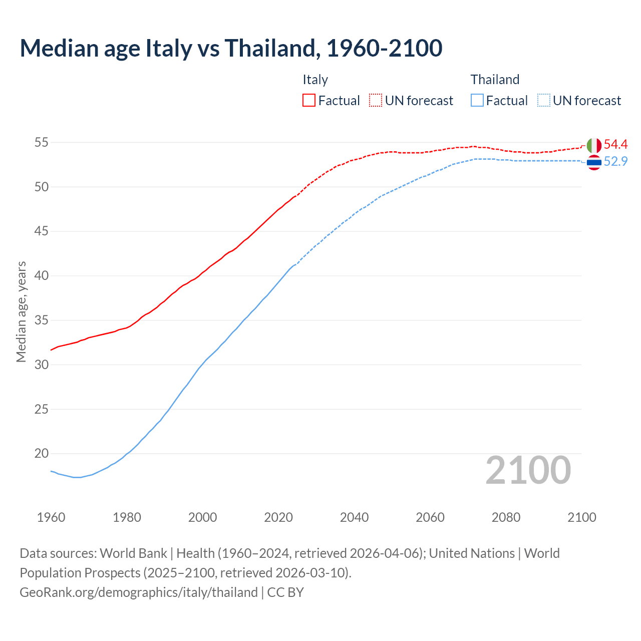 - Italy is ranked 4/196 by median age (oldest to youngest) vs 40/196 for Thailand.