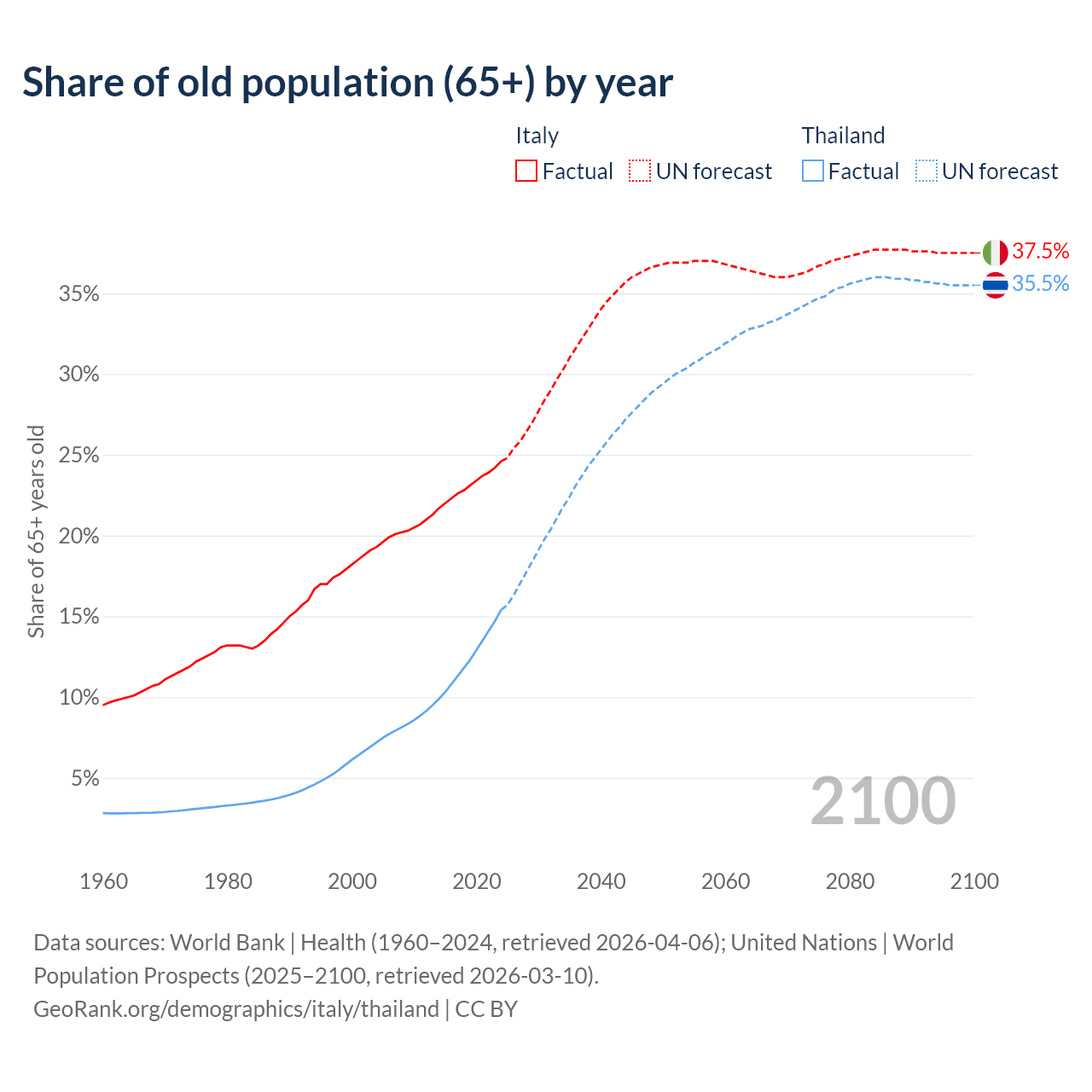 The share of older people aged 65 and over is 24.6% in Italy and 15.4% in Thailand. Life expectancy in Italy compared to Thailand .