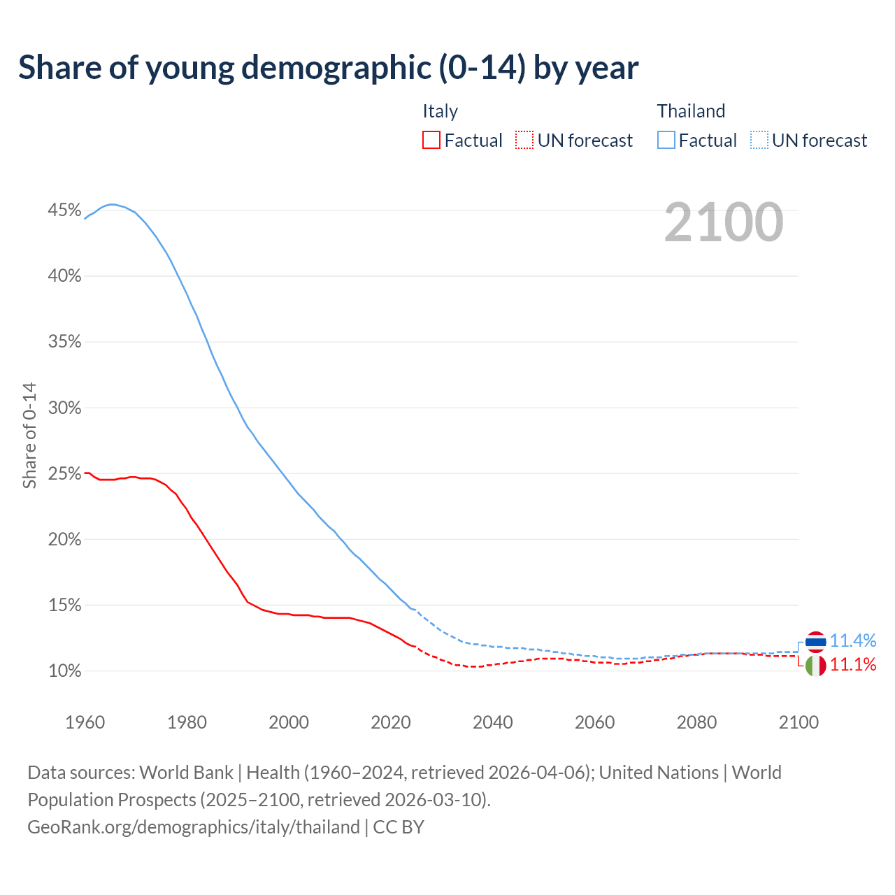 - The share of young demographic (0-15 years old) in Italy is 11.9% vs 14.7% in Thailand.