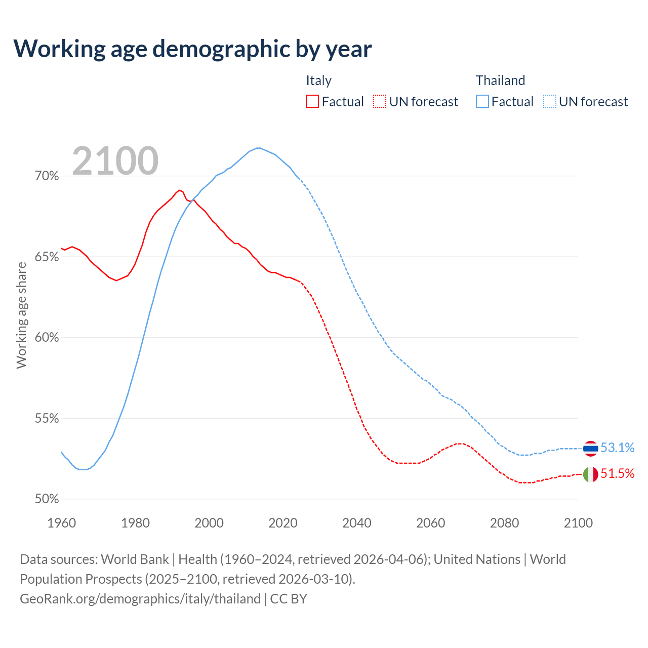 - Italy has 37.2M working age adults (aged 15-64) vs 50M in Thailand.