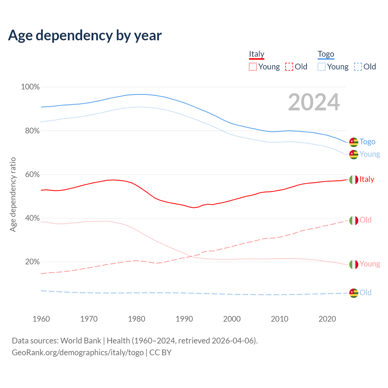 - Italy is ranked 4/196 by median age (oldest to youngest) vs 166/196 for Togo.
