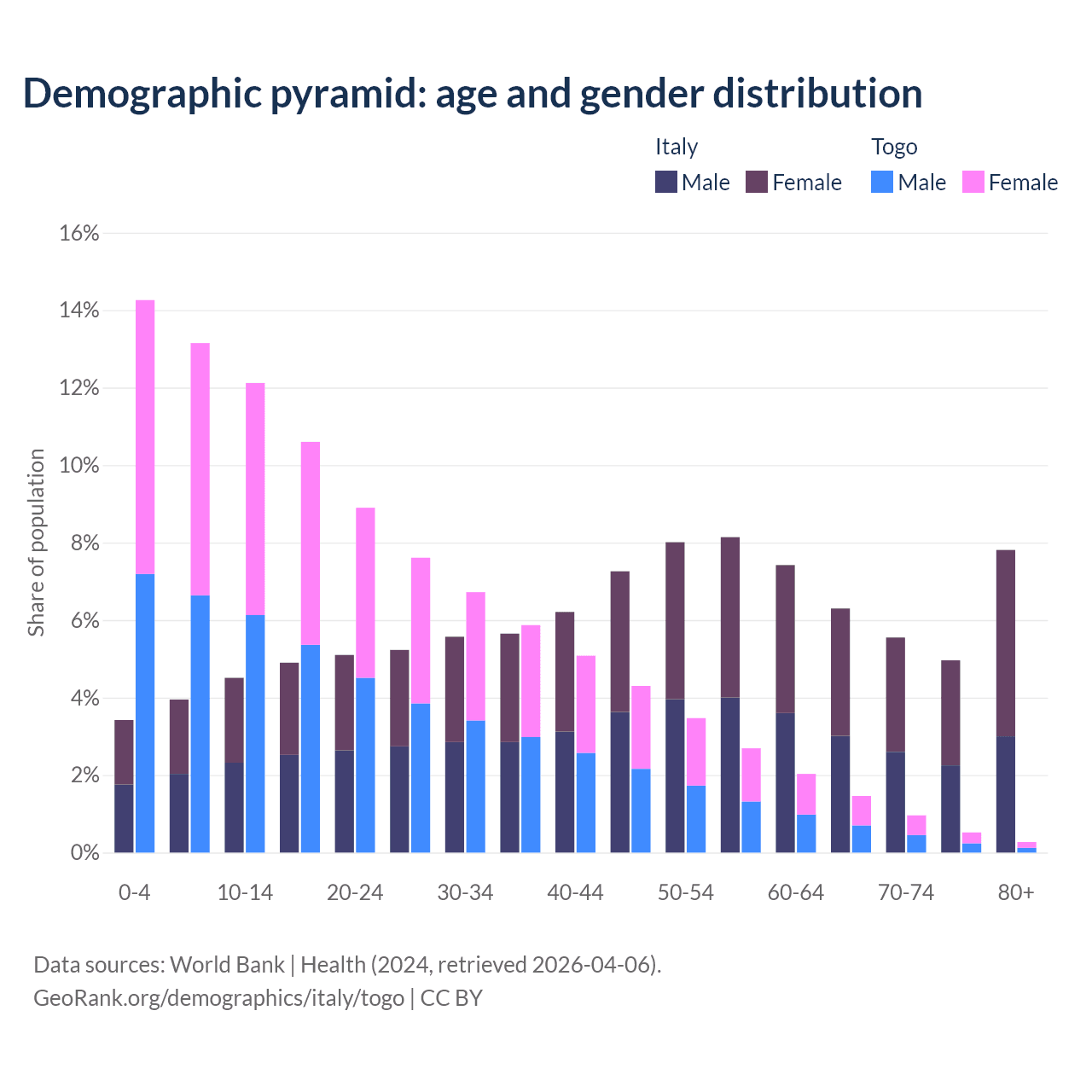 The share of older people aged 65 and over is 24.6% in Italy and 3.21% in Togo. Life expectancy in Italy compared to Togo .