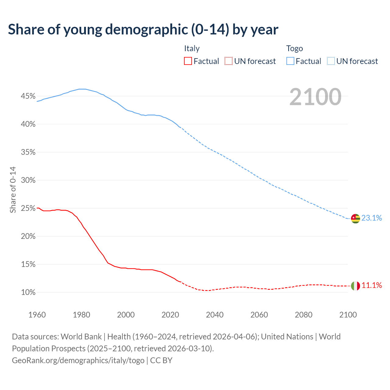 - The share of young demographic (0-15 years old) in Italy is 11.9% vs 39.5% in Togo.