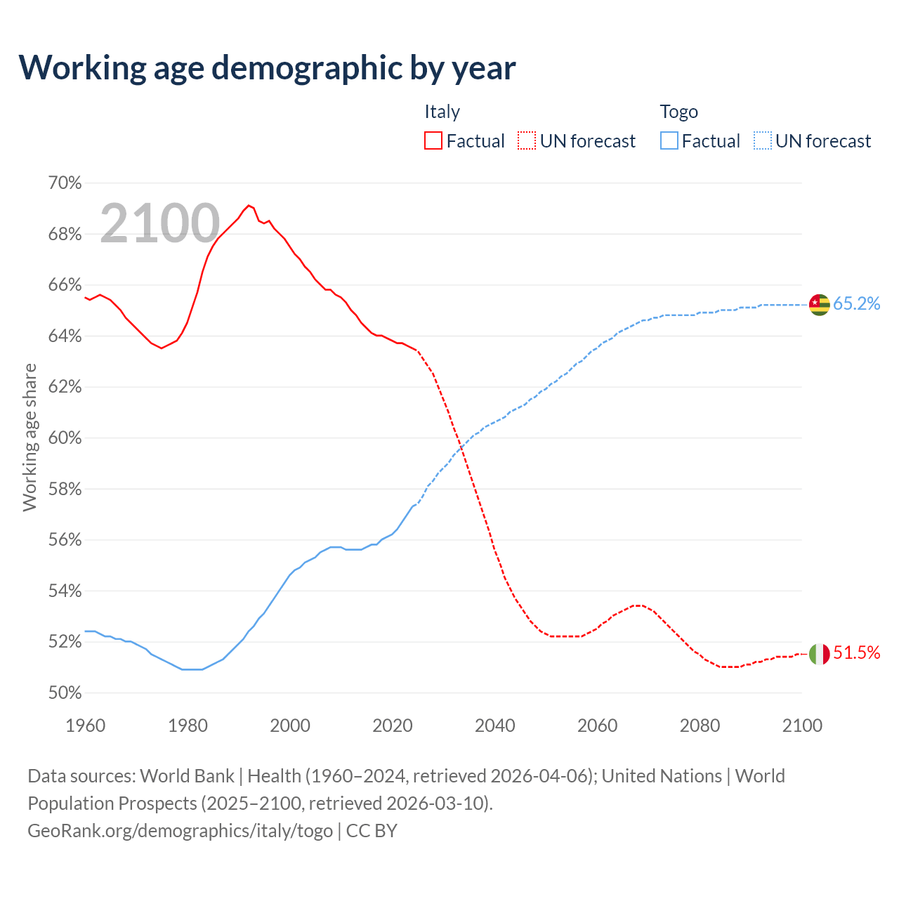 - Italy has 37.2M working age adults (aged 15-64) vs 5.72M in Togo.