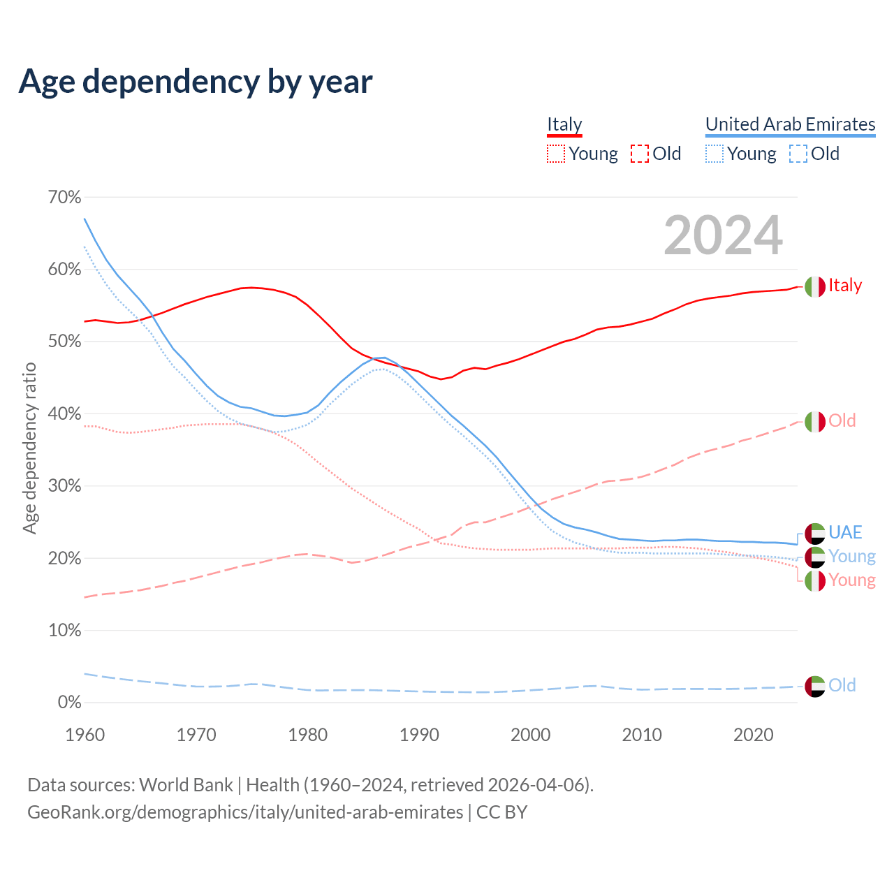 - Italy is ranked 4/196 by median age (oldest to youngest) vs 91/196 for the United Arab Emirates.
