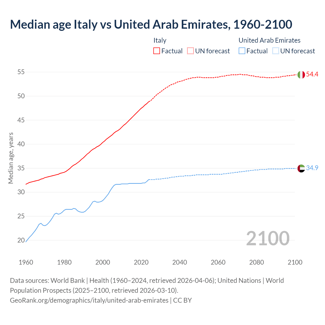 Median age Italy vs United Arab Emirates, 1960-2100