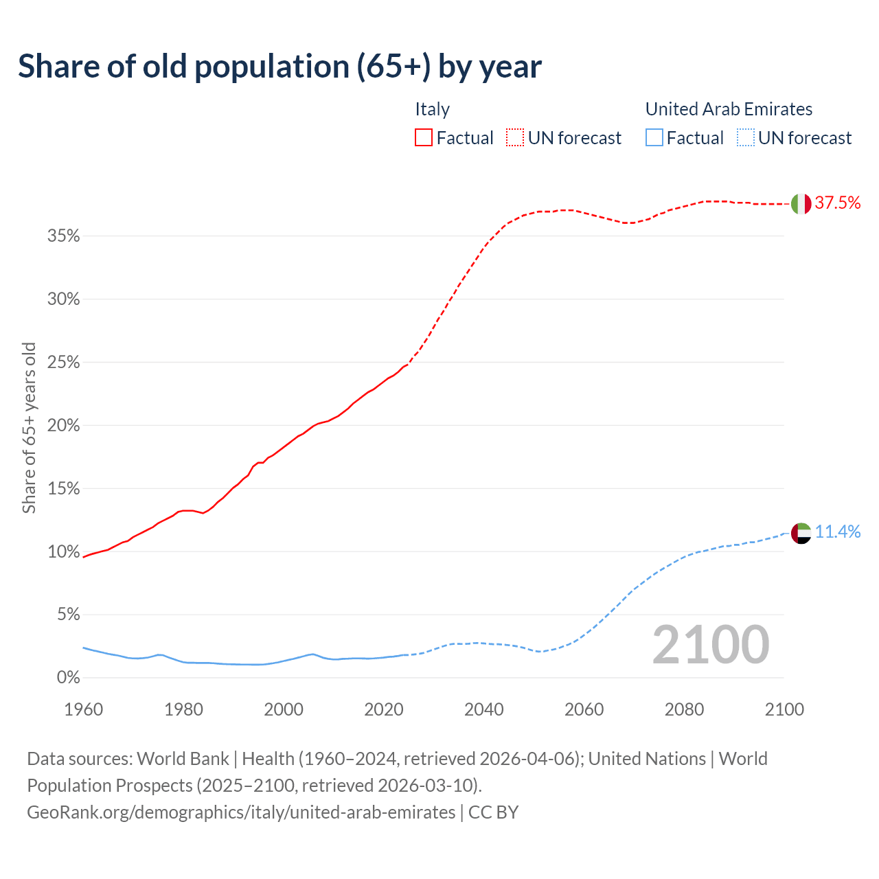 The share of older people aged 65 and over is 24.6% in Italy and 1.77% in the United Arab Emirates. Life expectancy in Italy compared to the United Arab Emirates .