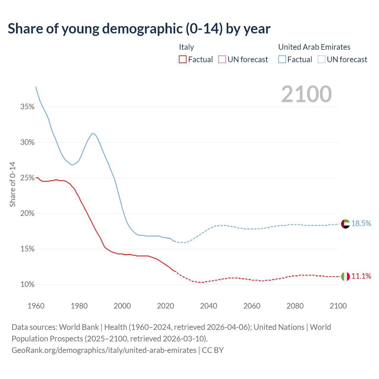 - The share of young demographic (0-15 years old) in Italy is 11.9% vs 16.1% in the United Arab Emirates.