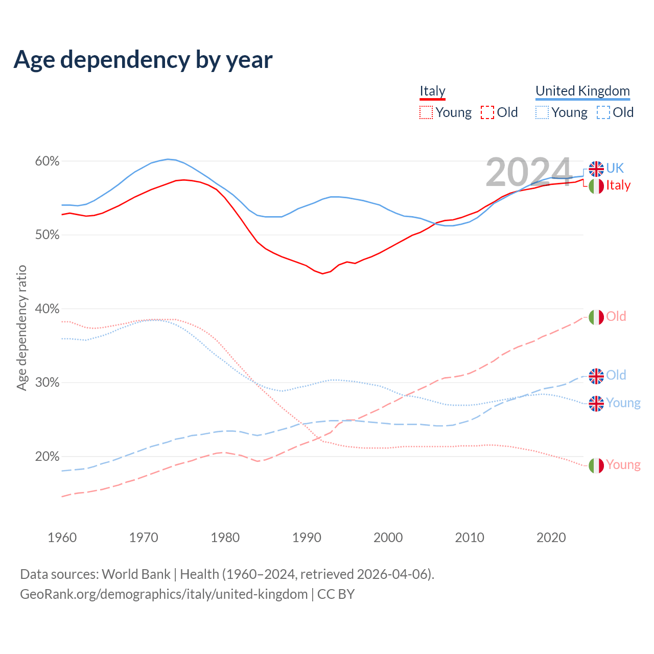 - Italy is ranked 4/196 by median age (oldest to youngest) vs 41/196 for the United Kingdom.