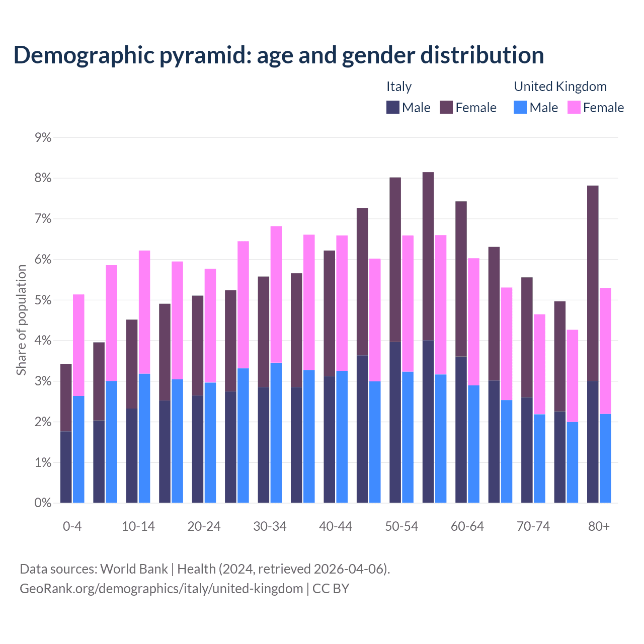- As of 2026, the population of Italy is 58.6M vs 70.2M in the United Kingdom.
