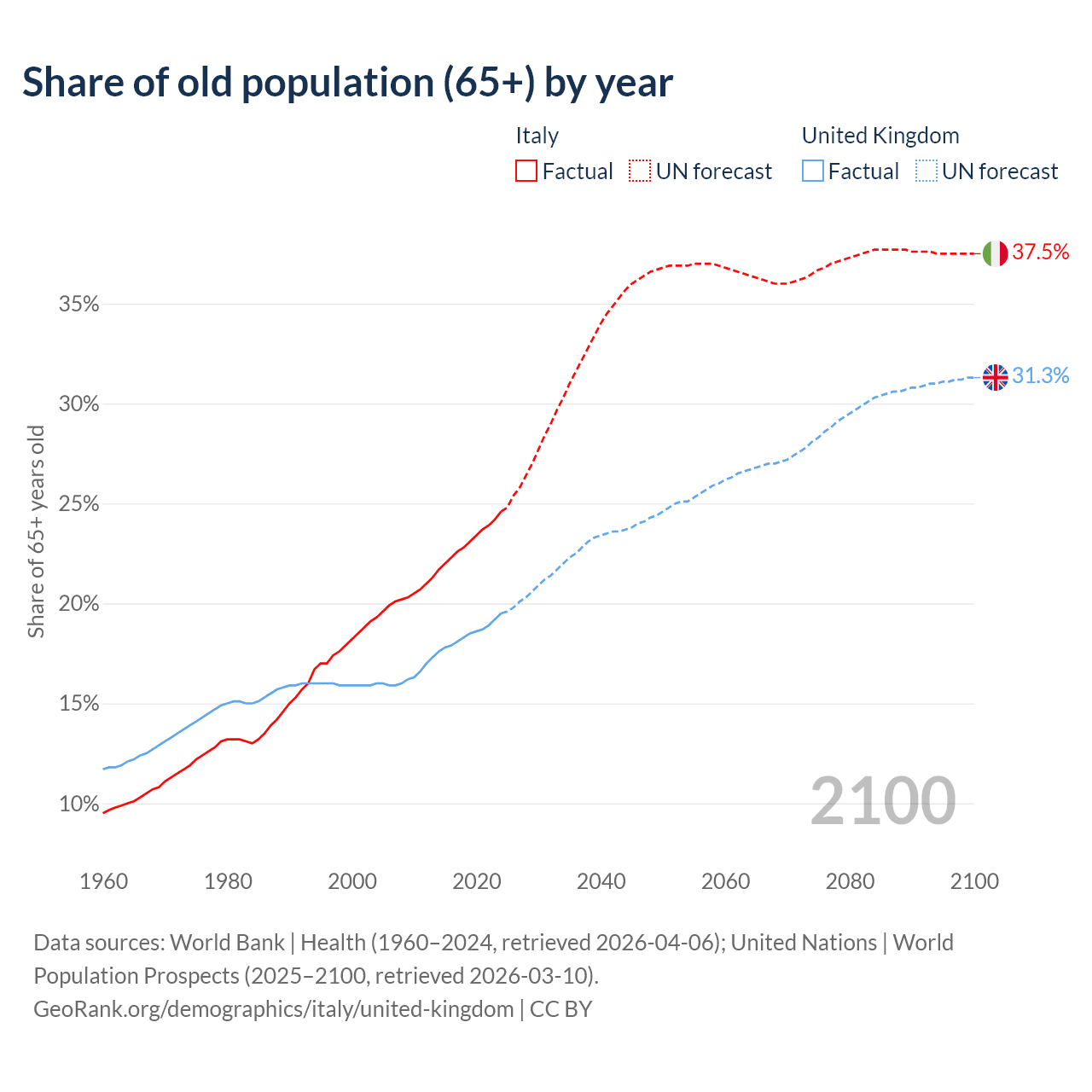 The share of older people aged 65 and over is 24.6% in Italy and 19.5% in the United Kingdom. Life expectancy in Italy compared to the United Kingdom .