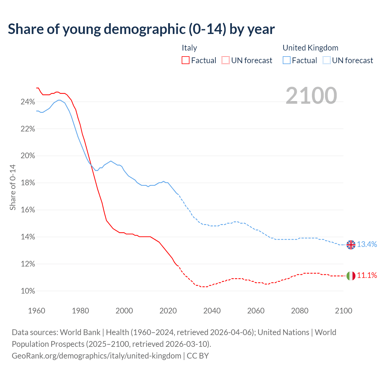 - The share of young demographic (0-15 years old) in Italy is 11.9% vs 17.2% in the United Kingdom.