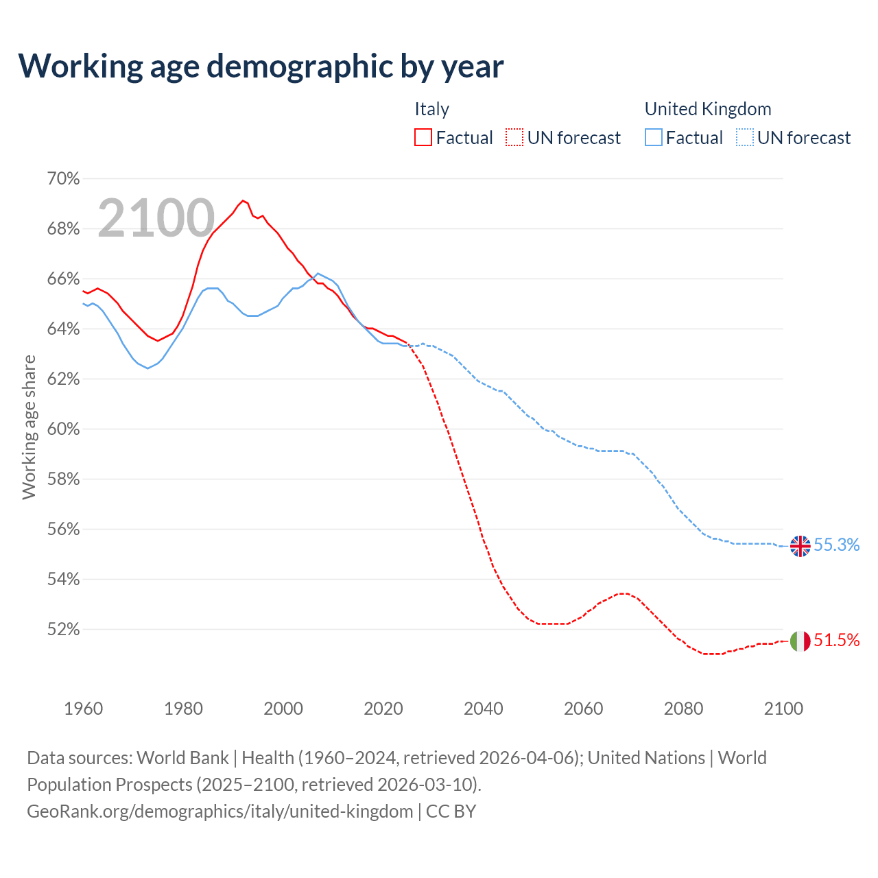 - Italy has 37.2M working age adults (aged 15-64) vs 44.4M in the United Kingdom.
