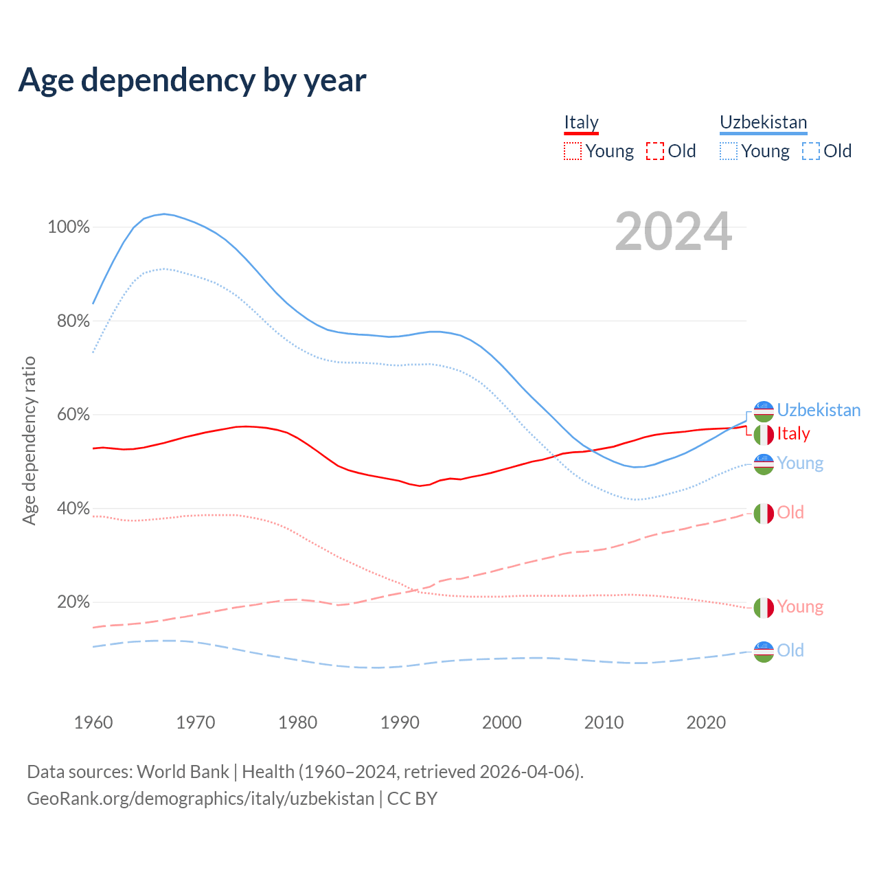 - Italy is ranked 4/196 by median age (oldest to youngest) vs 116/196 for Uzbekistan.