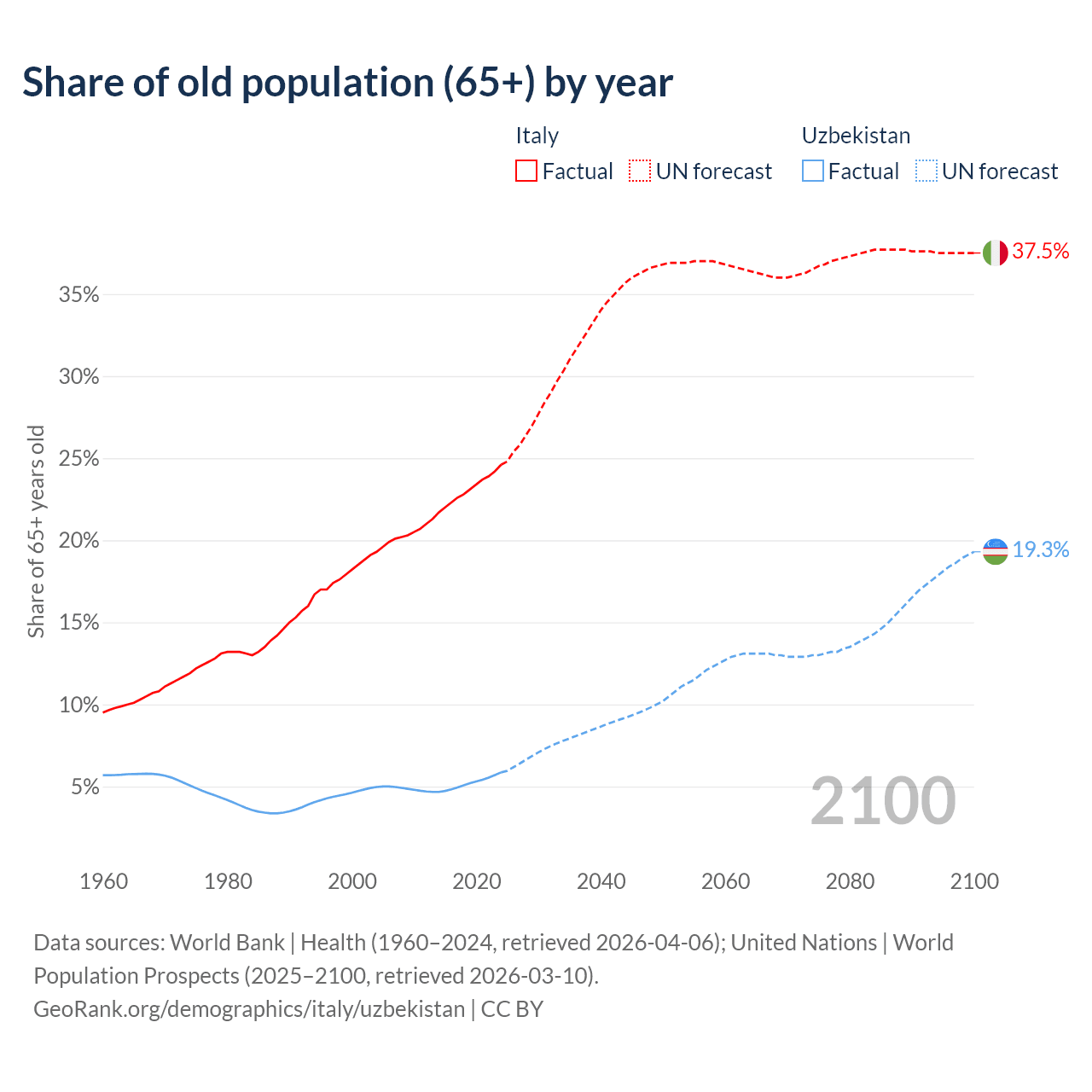 The share of older people aged 65 and over is 24.6% in Italy and 5.86% in Uzbekistan. Life expectancy in Italy compared to Uzbekistan .