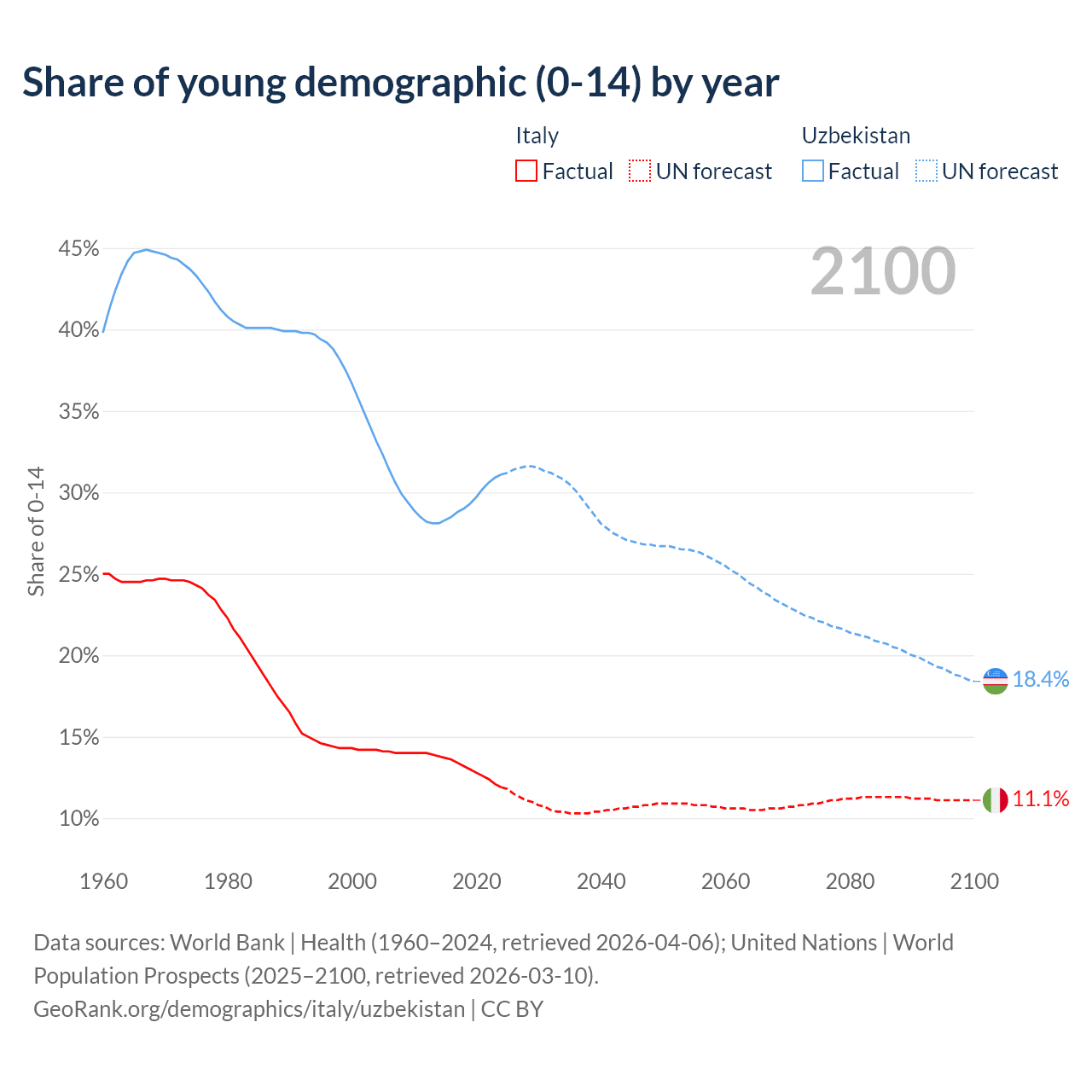 - The share of young demographic (0-15 years old) in Italy is 11.9% vs 31.1% in Uzbekistan.