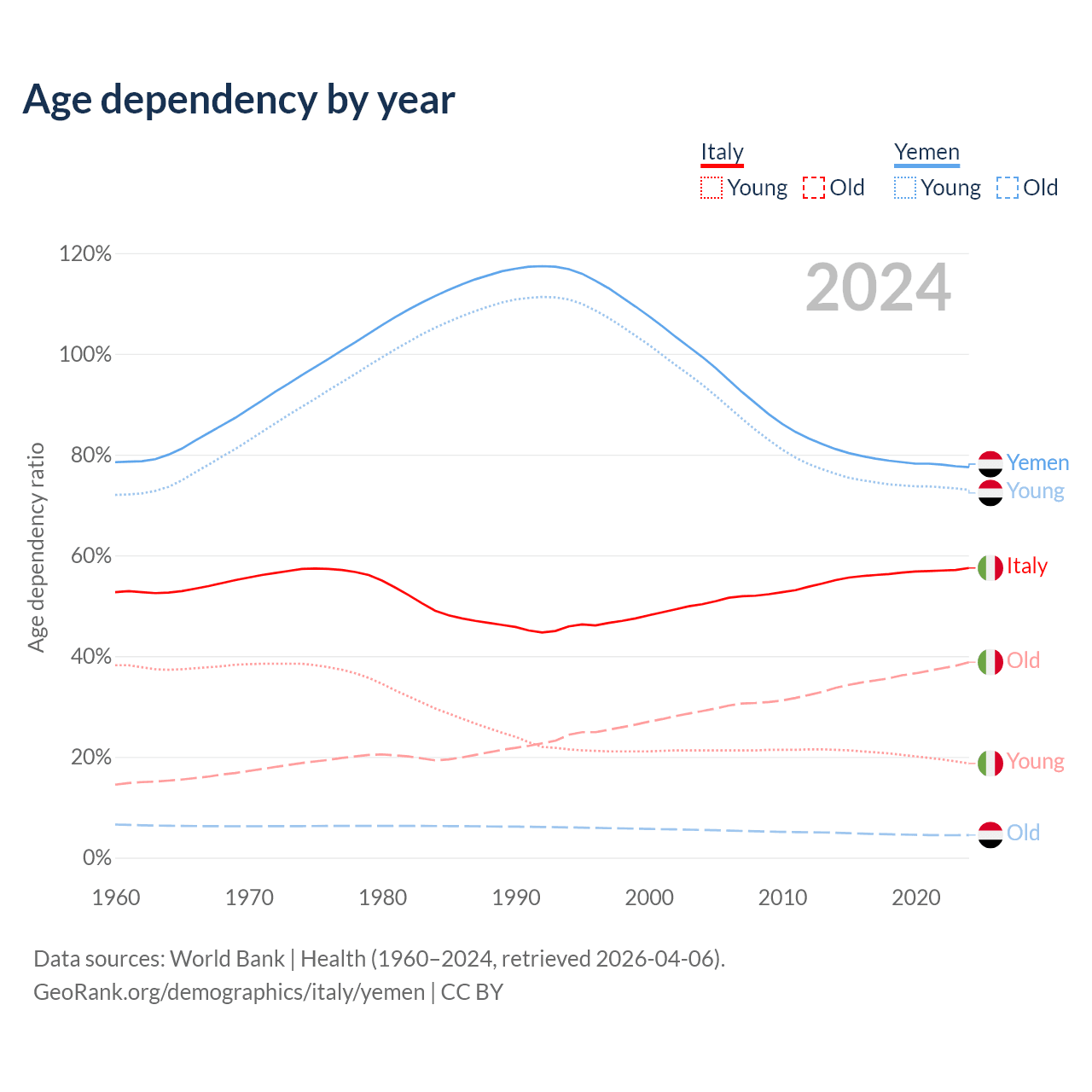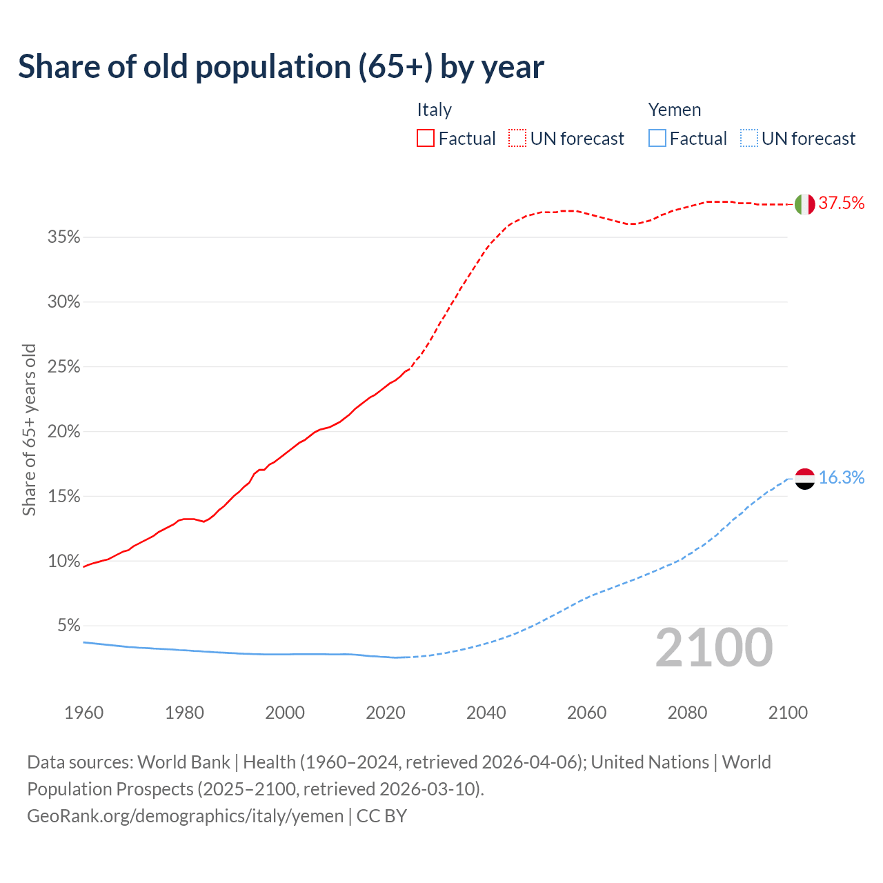 The share of older people aged 65 and over is 24.6% in Italy and 2.52% in Yemen. Life expectancy in Italy compared to Yemen .