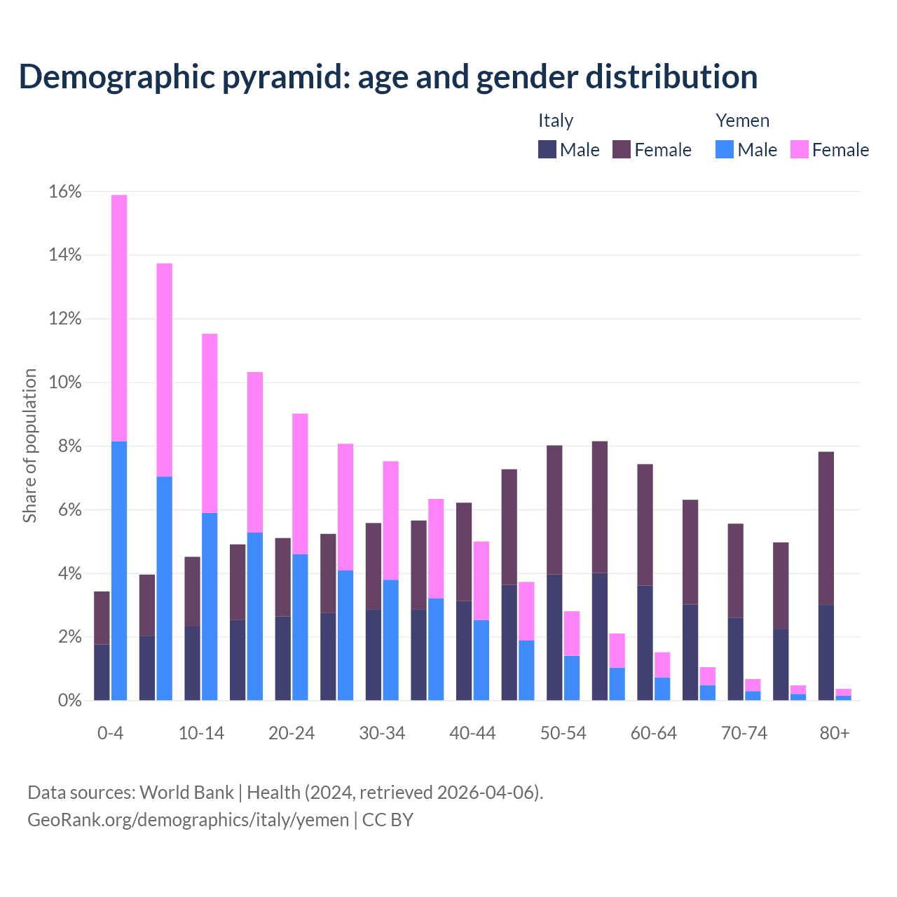 - Italy is ranked 4/196 by median age (oldest to youngest) vs 174/196 for Yemen.