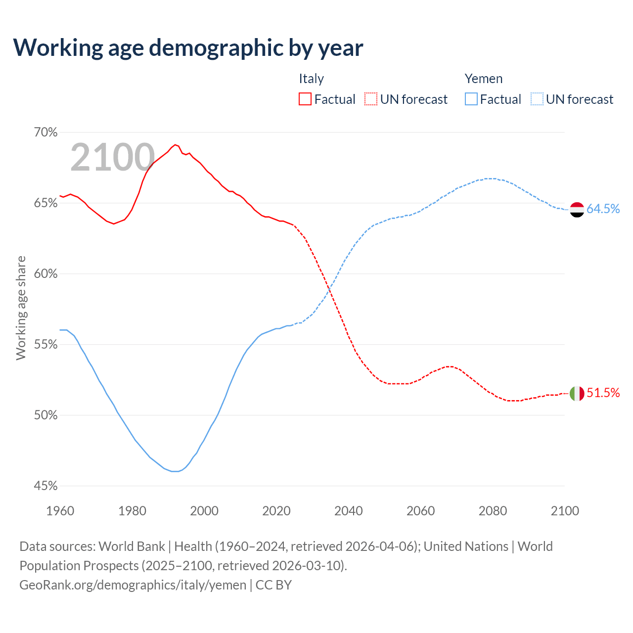 - Italy has 37.2M working age adults (aged 15-64) vs 24.4M in Yemen.