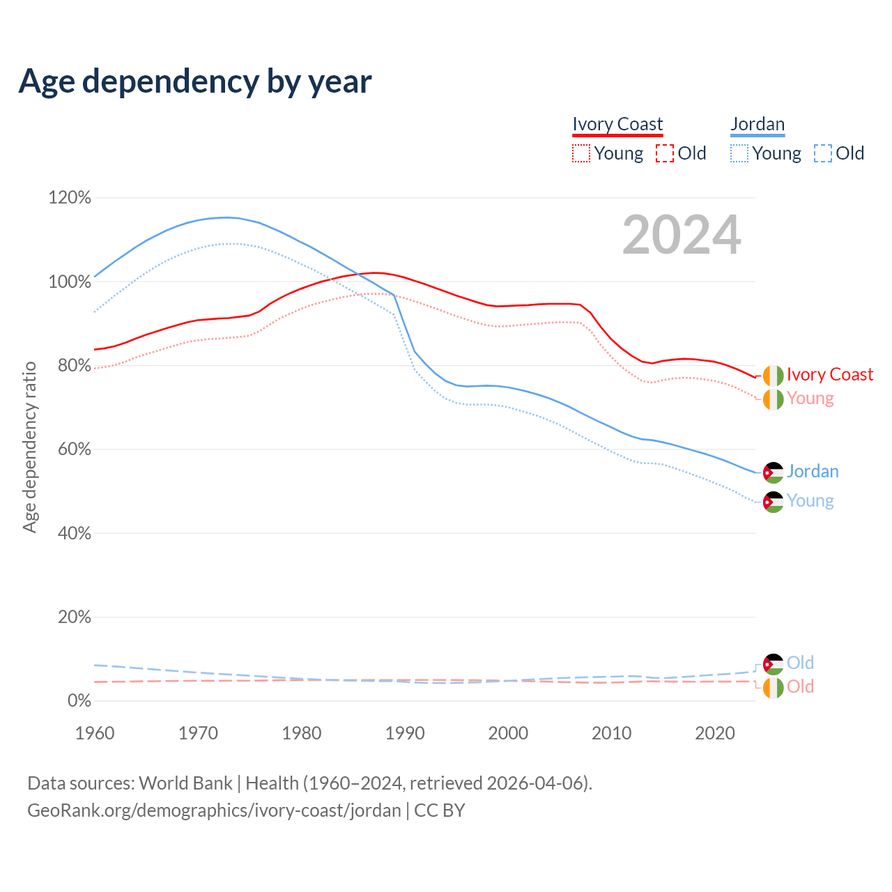 - Ivory Coast is ranked 175/196 by median age (oldest to youngest) vs 131/196 for Jordan.