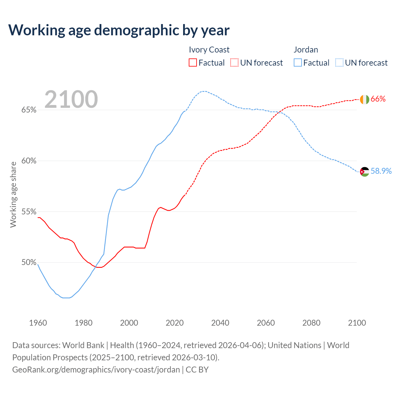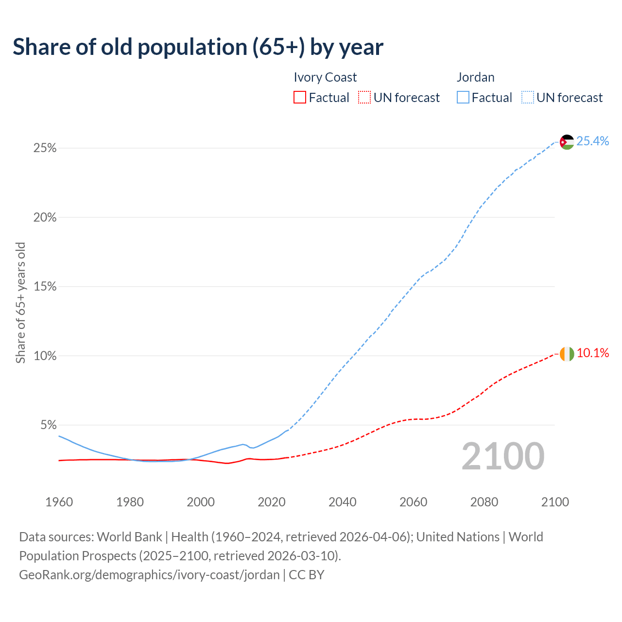 Median age Ivory Coast vs Jordan, 1960-2100