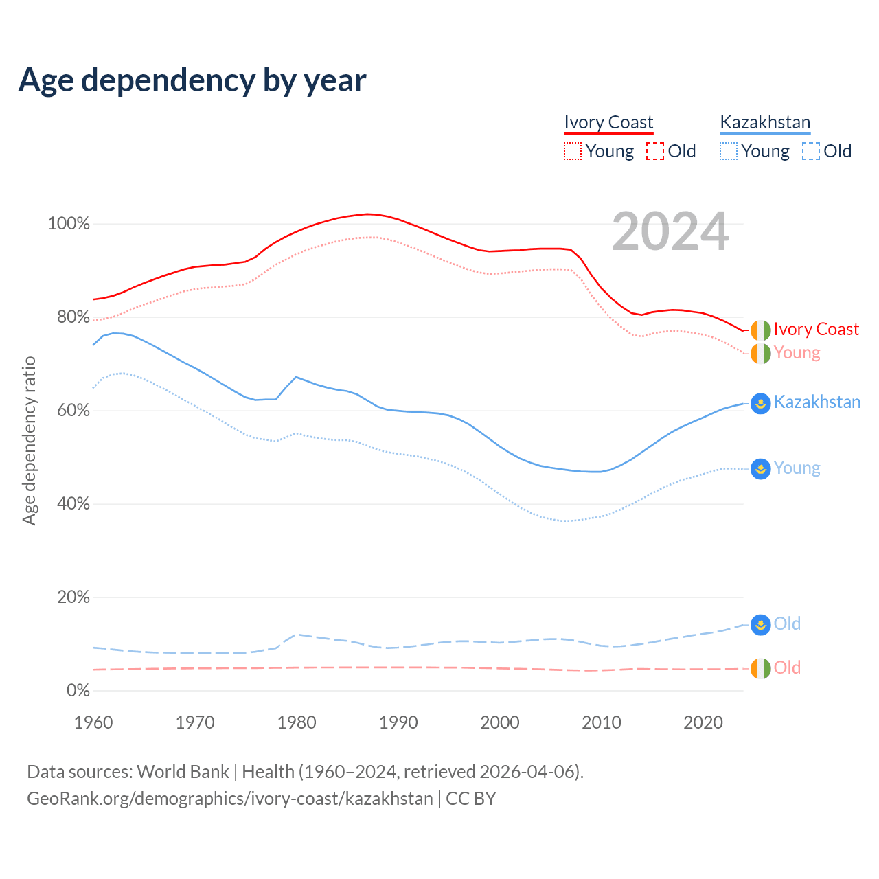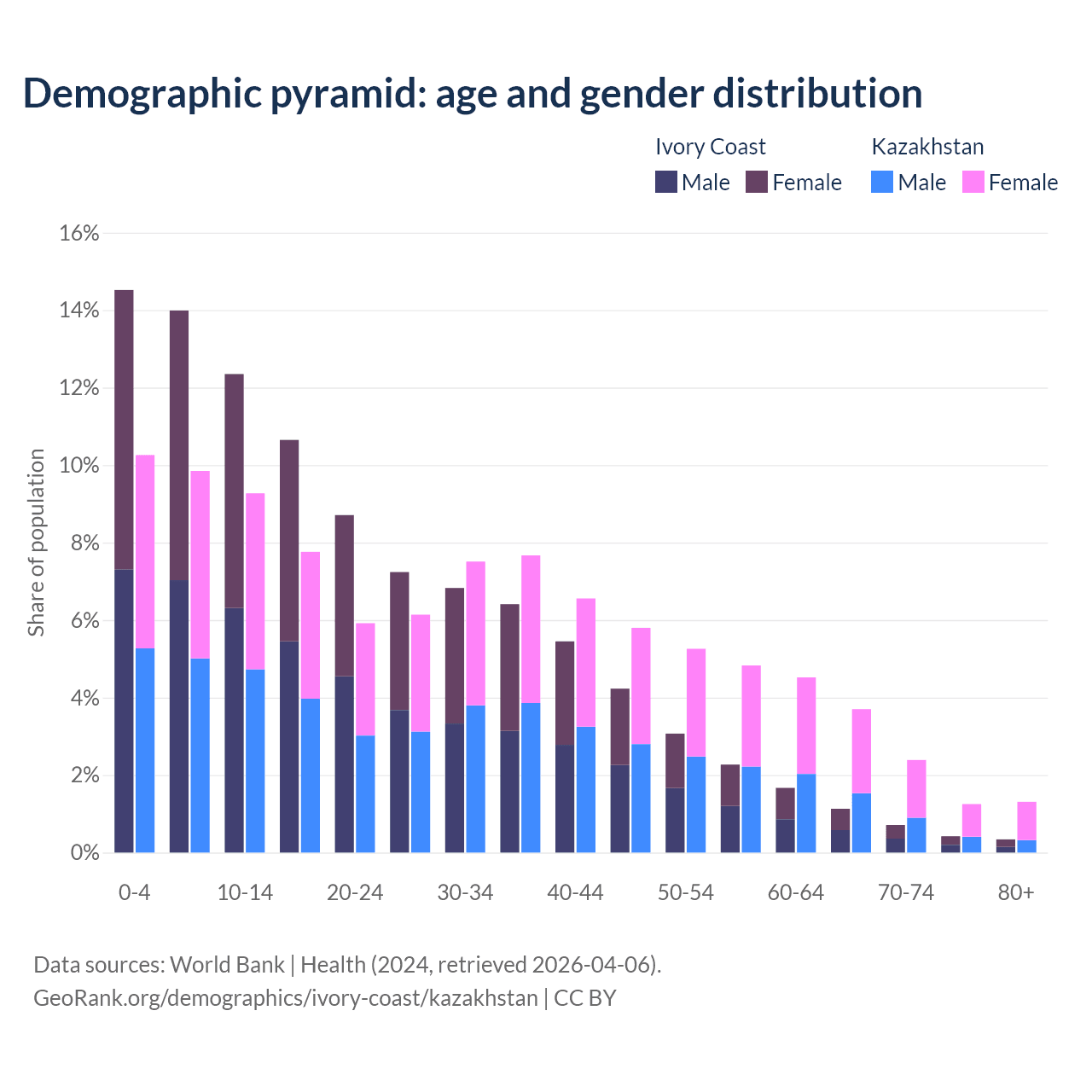 - Ivory Coast is ranked 175/196 by median age (oldest to youngest) vs 99/196 for Kazakhstan.