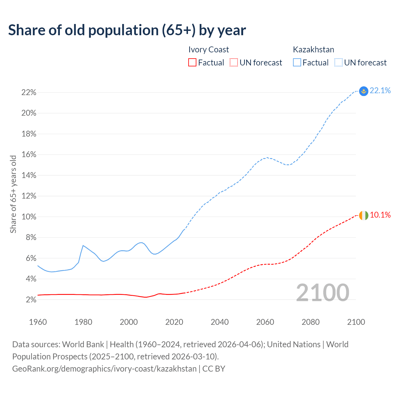The share of older people aged 65 and over is 2.61% in Ivory Coast and 8.65% in Kazakhstan. Life expectancy in Ivory Coast compared to Kazakhstan .