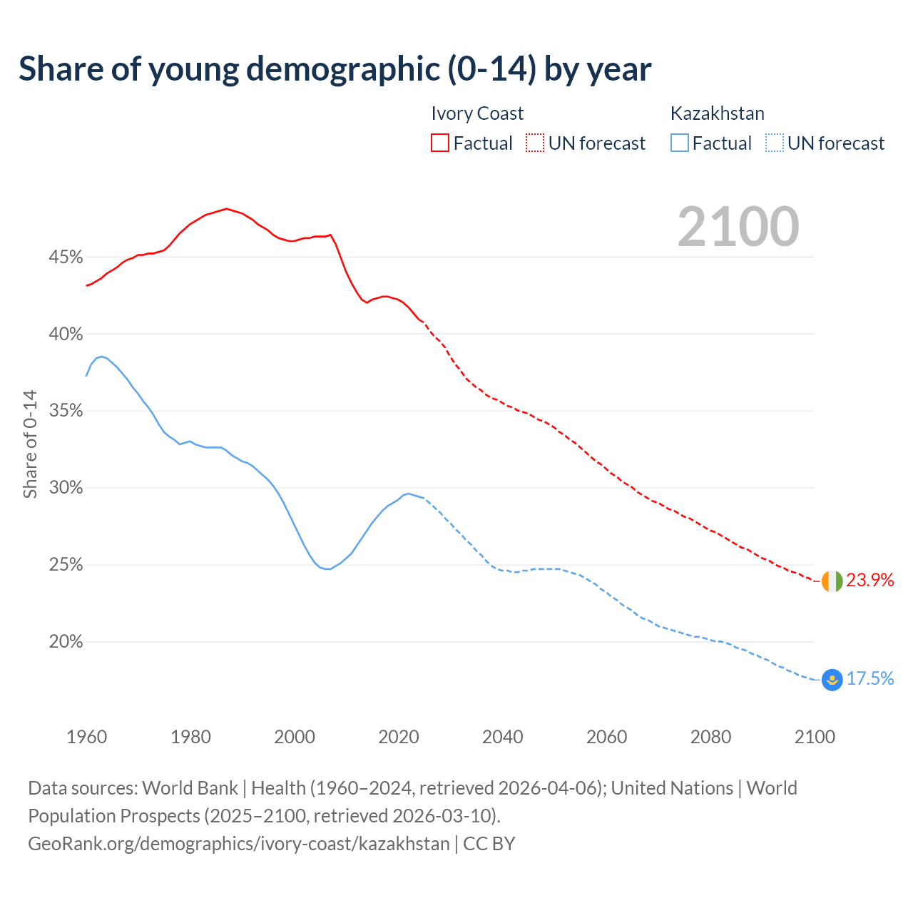 - The share of young demographic (0-15 years old) in Ivory Coast is 40.9% vs 29.4% in Kazakhstan.