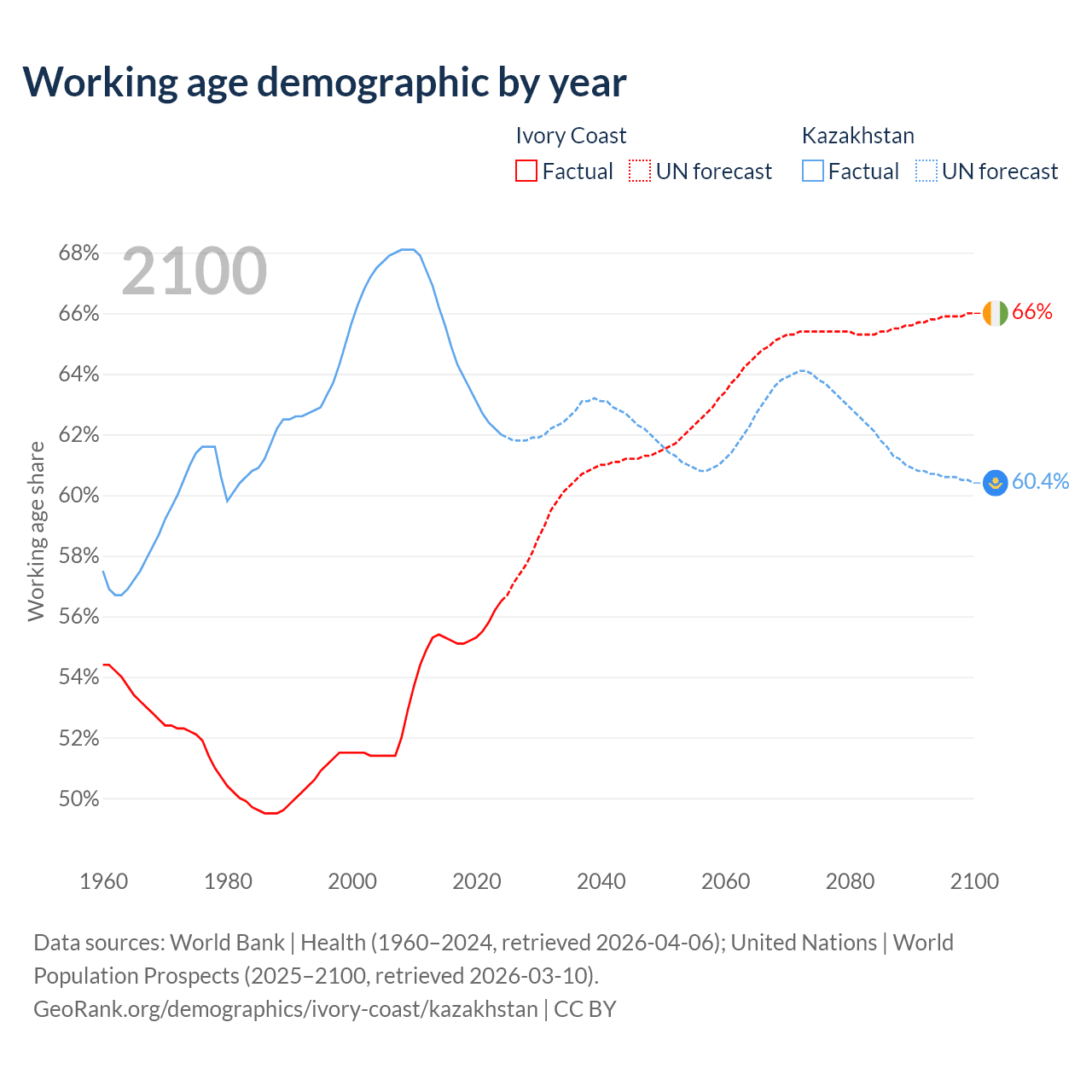 - Ivory Coast has 19.1M working age adults (aged 15-64) vs 13.1M in Kazakhstan.