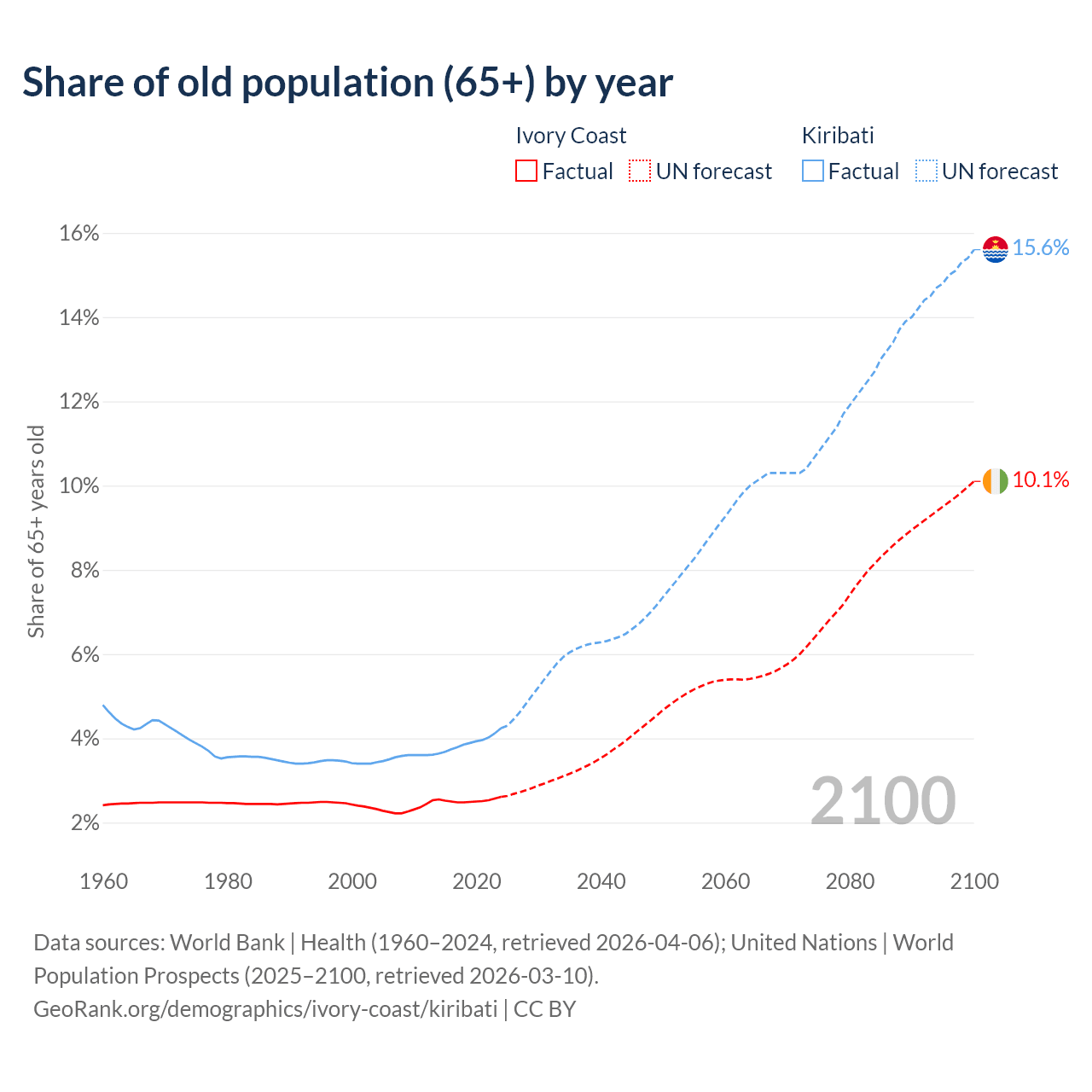 The share of older people aged 65 and over is 2.61% in Ivory Coast and 4.24% in Kiribati. Life expectancy in Ivory Coast compared to Kiribati .