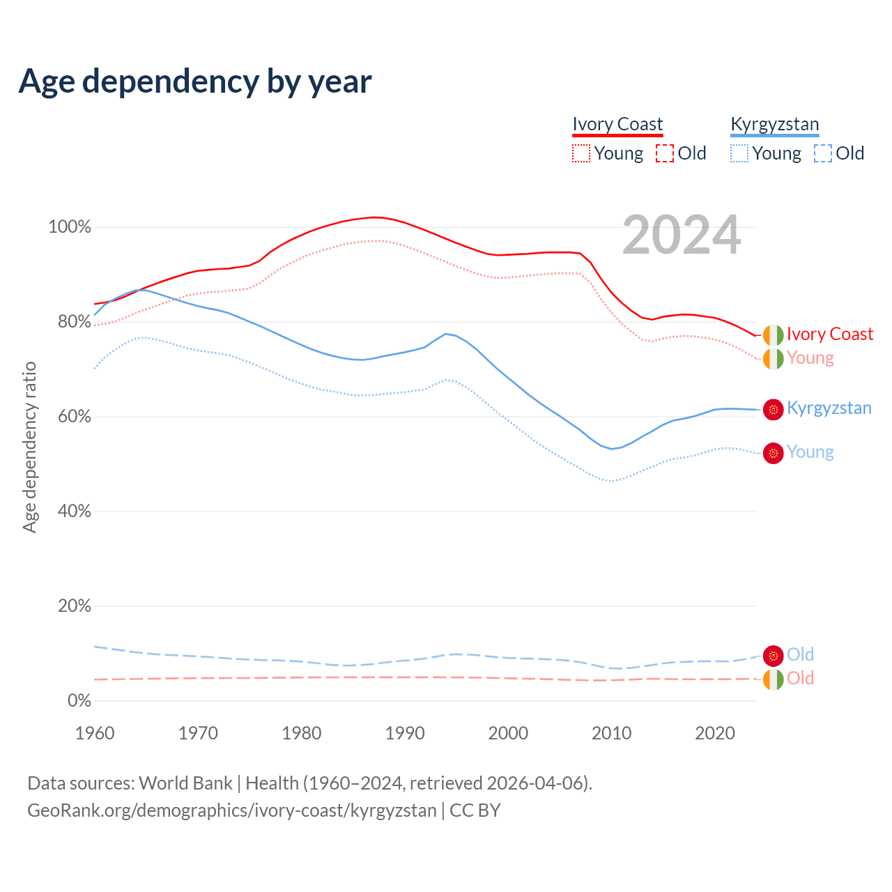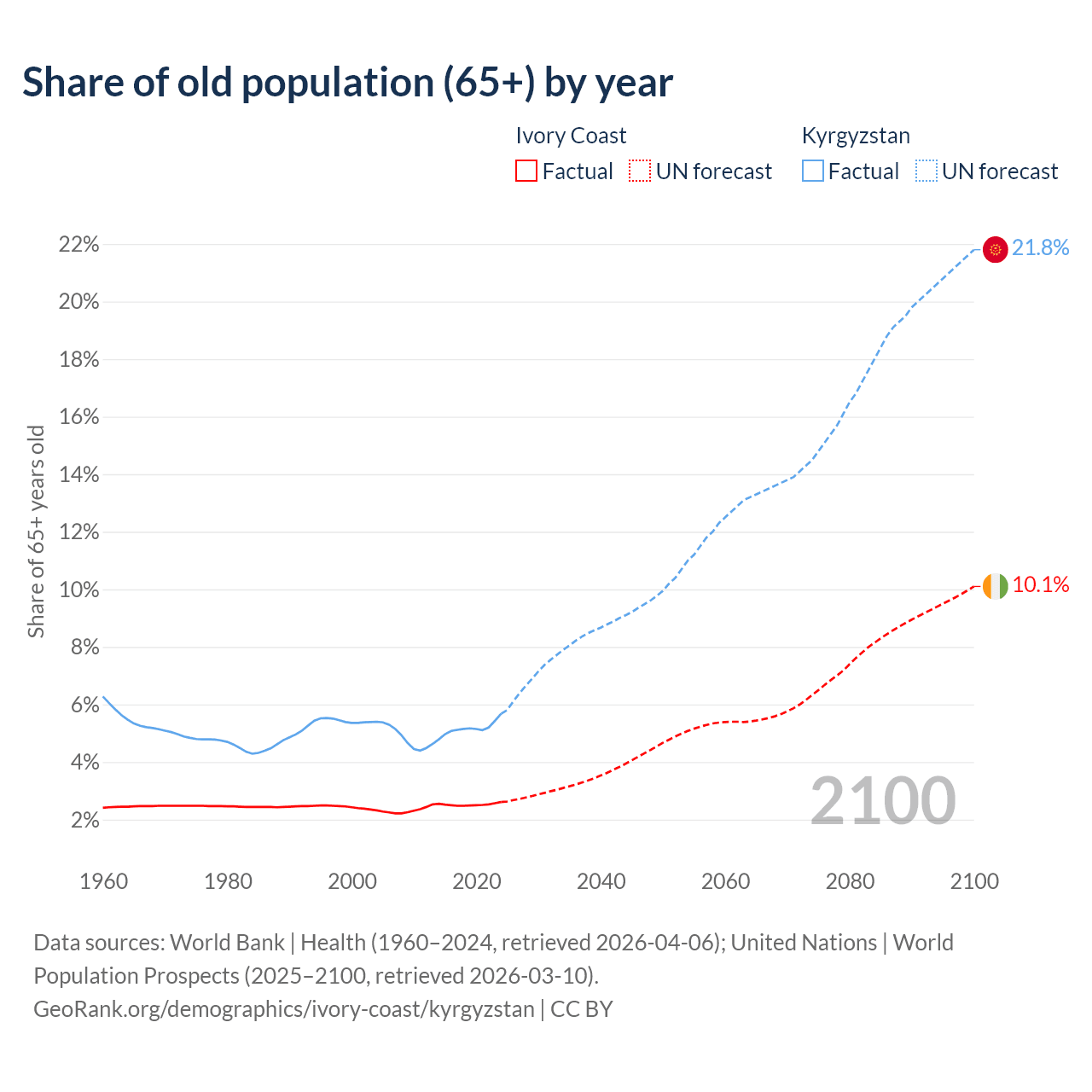 - The share of old-age demographic (65+) in Ivory Coast is 2.61% vs 5.68% in Kyrgyzstan.