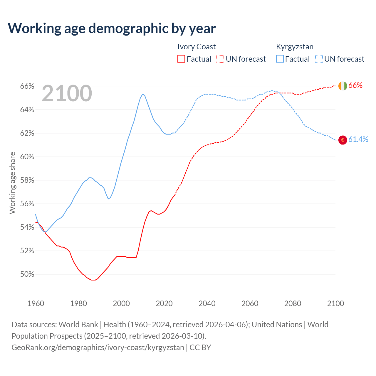 - Ivory Coast has 19.1M working age adults (aged 15-64) vs 4.63M in Kyrgyzstan.