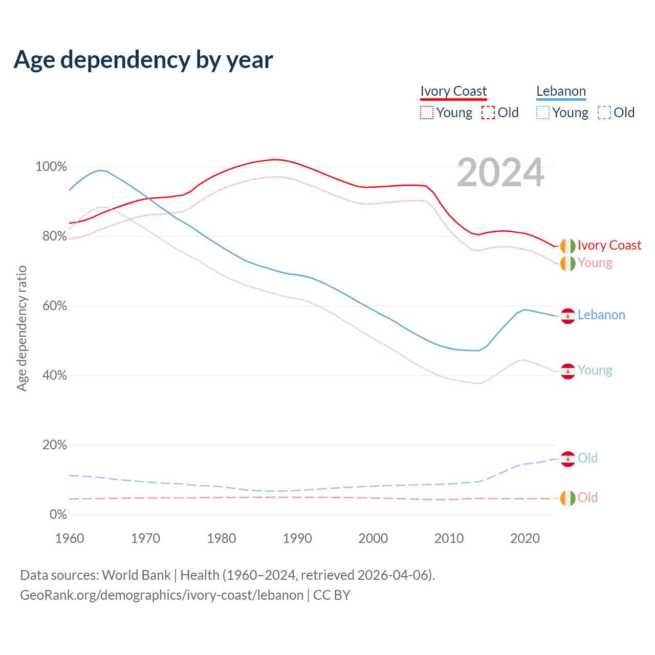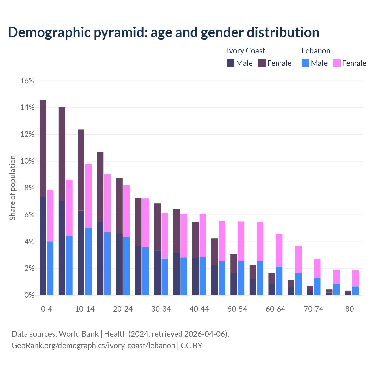 - Ivory Coast is ranked 175/196 by median age (oldest to youngest) vs 106/196 for Lebanon.