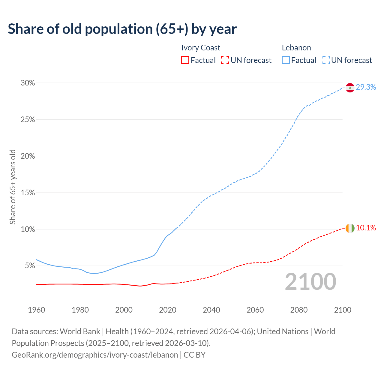 The share of older people aged 65 and over is 2.61% in Ivory Coast and 10.1% in Lebanon. Life expectancy in Ivory Coast compared to Lebanon .