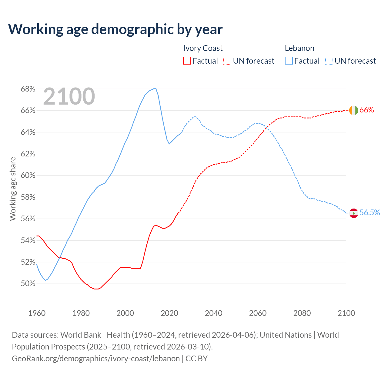 - Ivory Coast has 19.1M working age adults (aged 15-64) vs 3.76M in Lebanon.