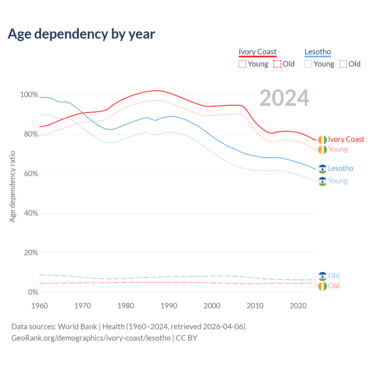 - Ivory Coast is ranked 175/196 by median age (oldest to youngest) vs 143/196 for Lesotho.