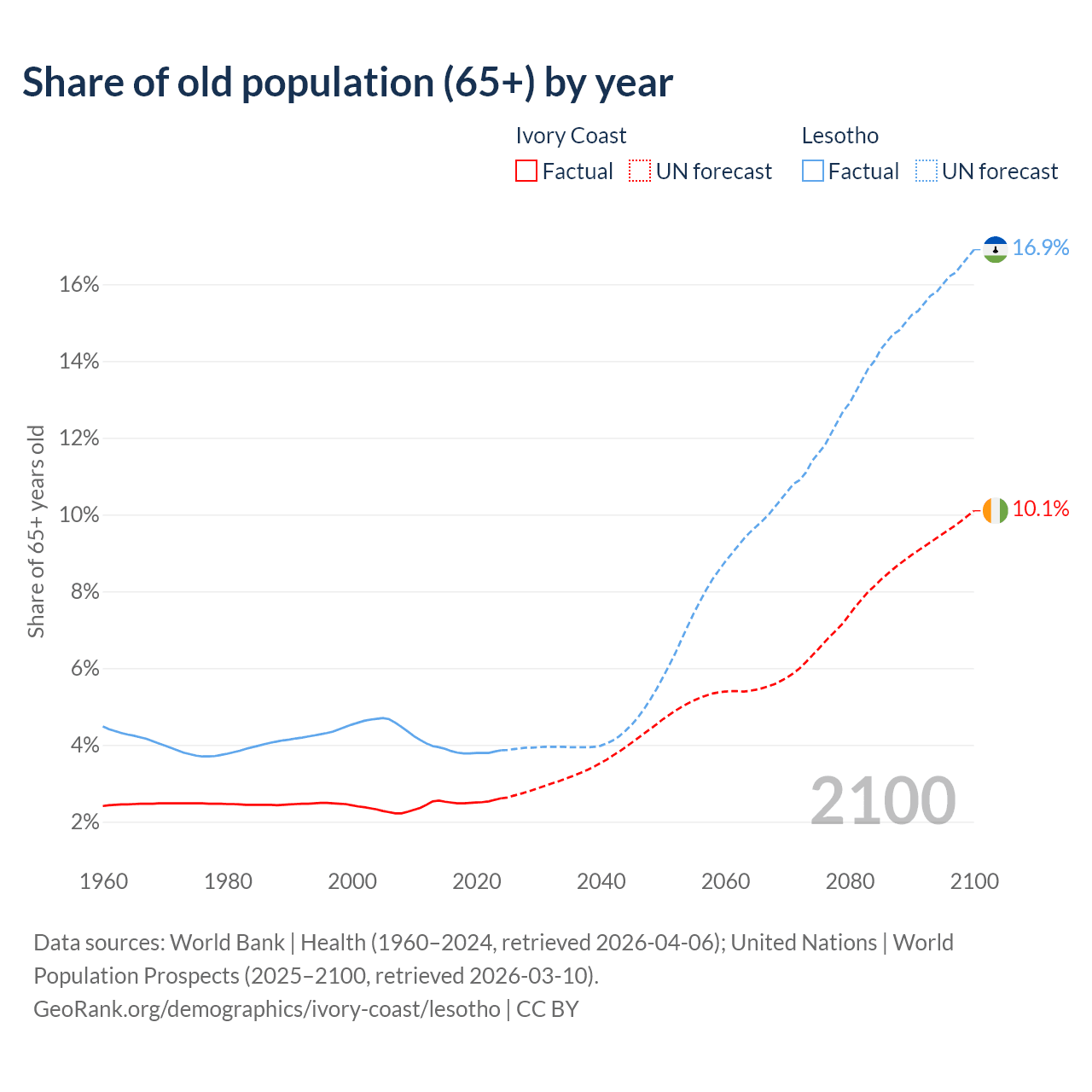 The share of older people aged 65 and over is 2.61% in Ivory Coast and 3.86% in Lesotho. Life expectancy in Ivory Coast compared to Lesotho .